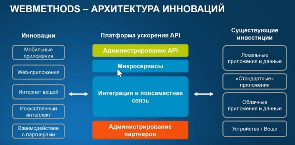 И сейчас осуществляются мощные инвестиции в устройства. С другой стороны, эти инновации ожидаются бизнесом. Это прежде всего продвижение этих функционалов стандартных и локальных приложений в область взаимодействия с мобильными, с web-приложениями. Интеграция с Интернетом вещей, привлечение ИИ для того, чтобы оценивать события и данные, происходящие в правой стороне слайда, а также совершенствовать взаимодействия с бизнес-партнерами. И в этом плане Software AG говорит, что у нее достаточно уникальная архитектура, которая позволяет связать эти два мира. Мир существующих инвестиций и насущных инноваций с помощью того, что мы поддерживаем все правильные и архитектурные решения, обеспечивая и администрирование бизнес-партнеров, интегрируя и обеспечивая взаимосвязь различных компонентов по различным протоколам и поддерживая архитектуру микросервисов, ориентированную в первую очередь на обеспечение гибкости и масштабируемости сервисов. Администрирование API это как вершина этого стека, поскольку взаимодействие приложений, перечисленных в правой части, с инновационными направлениями будет выполняться через программный интерфейс, через API.