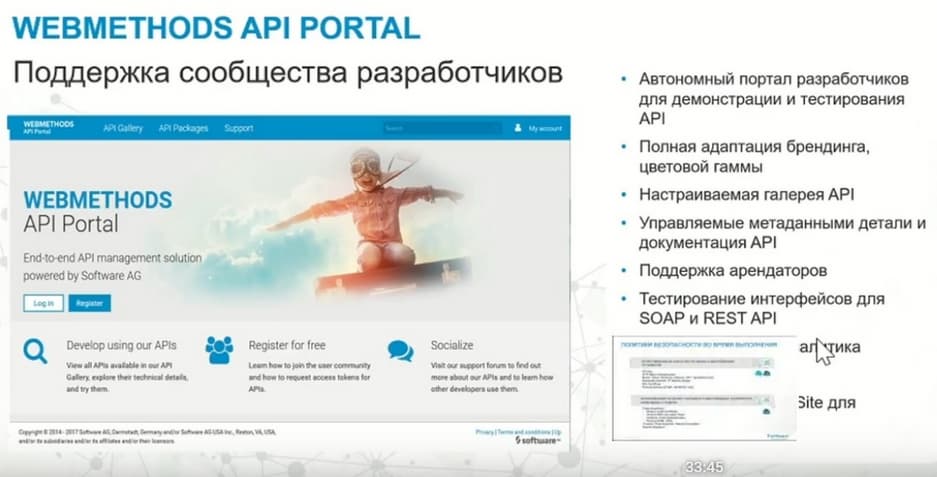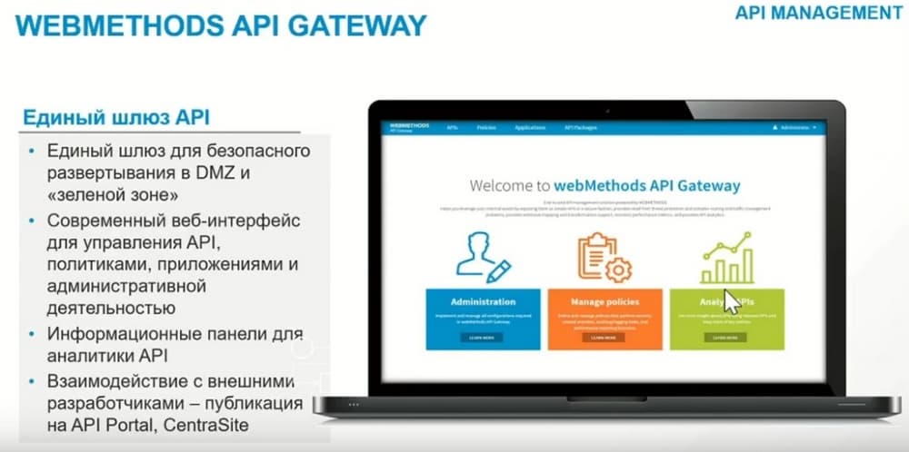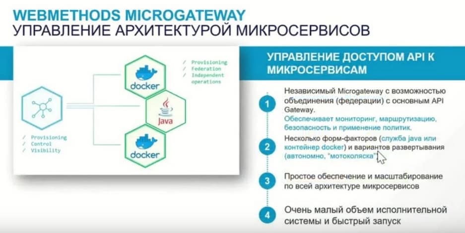 И вторым важным моментом является защита и контроль доступа к API с помощью детальных конфигураций и политик, которые характерны для конкретных API. И управление полным жизненным циклом с момента появления их на свет и до вывода из эксплуатации. Архитектурно - это поддержка все более набирающих силу архитектур микросервисов и дополняющих эту архитектуру WEBMETHODS MICROGATEWAY.