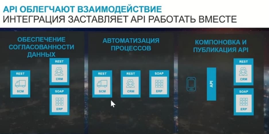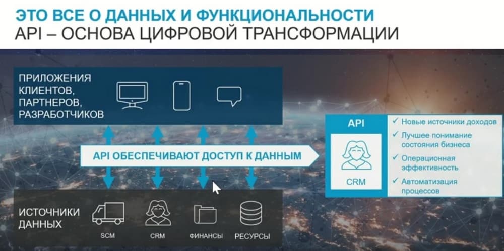 В этом плане важным компонентом цифрового преобразования или цифровой трансформации являются API, поскольку они могут обеспечить доступ к данным и функциям в базовых приложениях, в базах данных. Они позволяют разработчикам создавать новые приложения и решения без необходимости знания внутренних деталей систем, к которым они подключаются. Тем самым обеспечивают возможность получения новых источников доходов, лучшего понимания состояния бизнеса с точки зрения того, каким образом вы можете обнаружить, например, нарушения в цепочке поставок, и тем самым сократить потери в этой цепочке, и соблюдать сроки доставок и пр. Чтобы позволить вам повысить операционную эффективность и автоматизировать процессы, которые связаны с обработкой или предоставлением необходимой информацией.