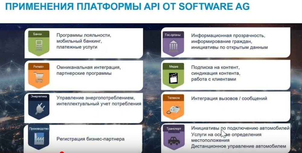 Платформа API Software AG не является чем-то совсем новым. Она развивается активно последние 5 лет. И за это время у Software AG появился богатый опыт или богатый перечень заказчиков в самых разных отраслях промышленности. Это и банки, и ретейл, и телеком и медиа, и транспорт, и производство. И это говорит о том, что каждой из этих отраслей платформы API от Software AG помогает решать вполне конкретные бизнес-задачи. И в чем их уникальность? Наверное, она может быть сформирована тремя основными моментами.