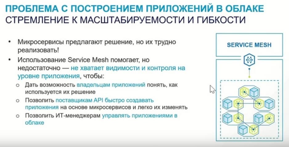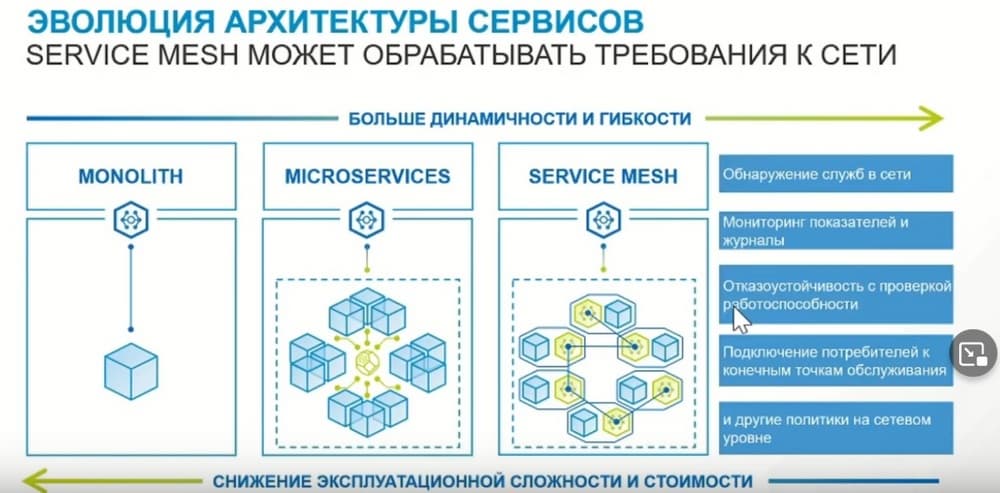 Говоря о том, как эволюционировала архитектура сервисов, следует отметить, что развитие идет в сторону повышения динамичности и гибкости данных сервисов. И переход на микросервисы этому очень способствует, поскольку микросервисы объединяются в контейнеры, которые могут развертываться по необходимости и перемещаться между ЦОДами и облаками. Но только необходимо отметить, что эксплуатационная сложность и стоимость этого решения возрастает. И еще больше она возрастает, когда появляются сети сервисов. Эти Service Mesh, достаточно современная «штука». Потому что сервисные сети решают важную задачу.