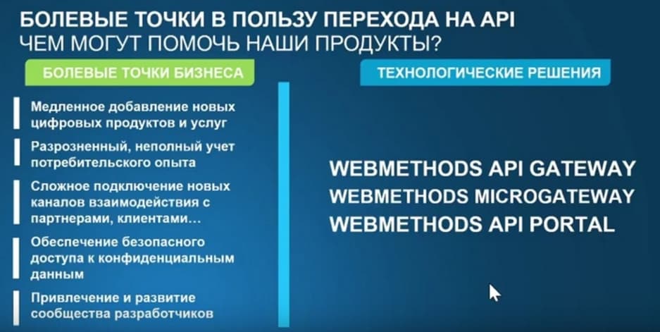 Рассматривая болевые точки бизнеса, которые существуют или могут быть сформулированы таким образом, как это изображено на слайде слева, Software AG подготовила и активно внедряет у заказчиков следующие три основные продукта: WEBMETHODS API GATEWAY и WEBMETHODS MICROGATEWAY - это инструментарии для того, чтобы заниматься разработкой и публикацией API, оценивать и проводить мониторинг выполнения или использования данных API. И WEBMETHODS API PORTAL - это тот инструмент, с помощью которого решаются задачи ознакомления потенциальных пользователей с возможностями этого API, его тестирования, привлечения и развития сообщества разработчиков, поскольку на его базе можно проводить довольно популярные сейчас хакатоны по разработке каких-то конкретных решений по развитию той или иной инициативы в области API.