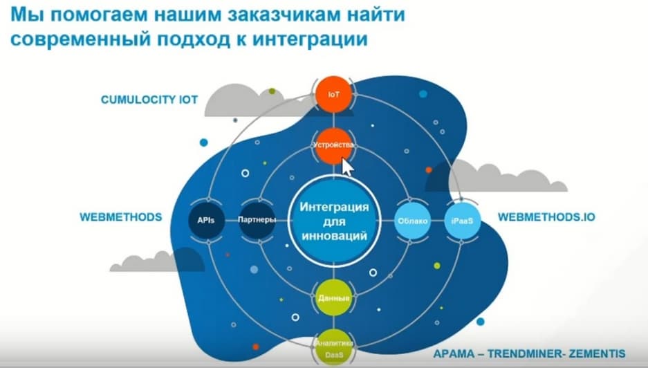 Семейство продуктов, отвечающих за управление и работу с Интернетом вещей, это CUMULOCITY IoT. Основная интеграционная платформа, существующая в гибридном варианте и варианте развертывания в ЦОДе, и в облаке и обеспечивающая бесшовное взаимодействие двух разных платформ – WEBMETHODS и WEBMETHODS.IO. И того, что касается обработки больших объемов событийных данных, таких как APAMA, как ZEMENTIS, являющейся интерфейсом между средствами разработки правил ИИ и их внедрения в промышленную работу. TRENDMINER – это продукт, который активно используется для анализа процессов, особенно в химической отрасли.