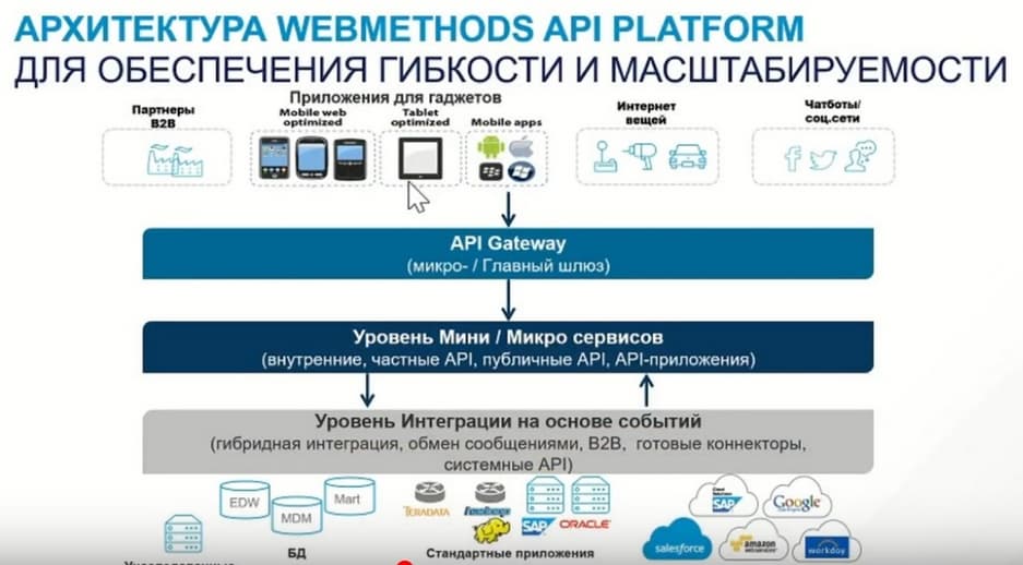 В этом плане архитектурно WEBMETHODS выглядит достаточно просто, но многоуровнево. С одной стороны, есть уровень интеграции, который обеспечивает взаимодействие с готовыми коннектерами, которые осуществляют обмен сообщениями, обмен документами business to business между унаследованными системами, базами данных, стандартными приложениями, развертываемыми как на предприятии, так и в облачных приложениях. А, учитывая то, что в каждой из этих видов источников информации или будучи их приемниками, имея свои специфики в плане протоколов, в плане представления форматов данных, необходимо это все нивелировать, вот для этого и используется уровень интеграции. Когда же мы начинаем переходить на уровень масштабируемости системы для повышения гибкости, мы переходим на слой мини- и микросервисов. Они доказали свою применимость, и именно этот уровень реализует масштабируемость, повышает гибкость и устойчивость всей системы.