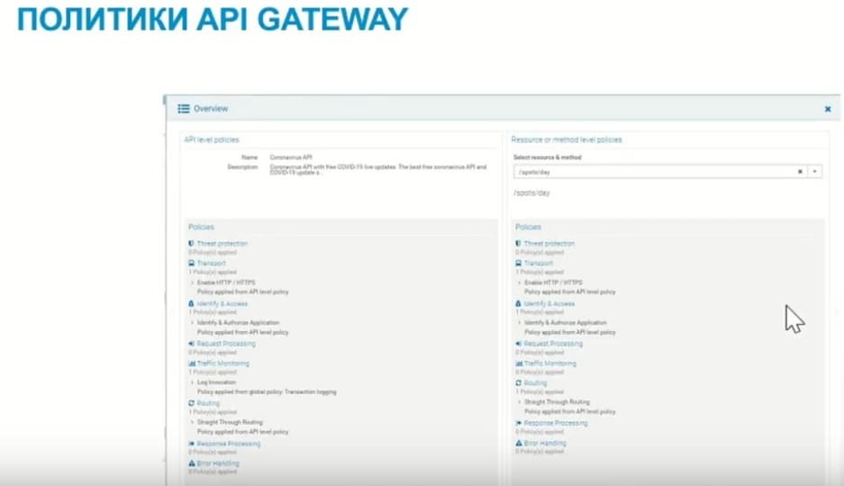 Примеры тех политик, которые могут быть реализованы в GATEWAY, приведены на слайде. Их восемь: 1) защита от угроз, 2) определение транспорта, 3) идентификация и права доступа на конкретный API, 4) возможность трансформации для обработки входящих запросов, 5) возможности мониторинга трафика, 6) маршрутизация (получив запрос, шлюз имеет возможность выполнить маршрутизацию напрямую, или может выполнить маршрутизацию исходя из значений заголовков или даже текста того сообщения, которое он получил), 7) обработка ответов, 8) обработка ошибок, которые возникают при выполнение этих сервисов.
