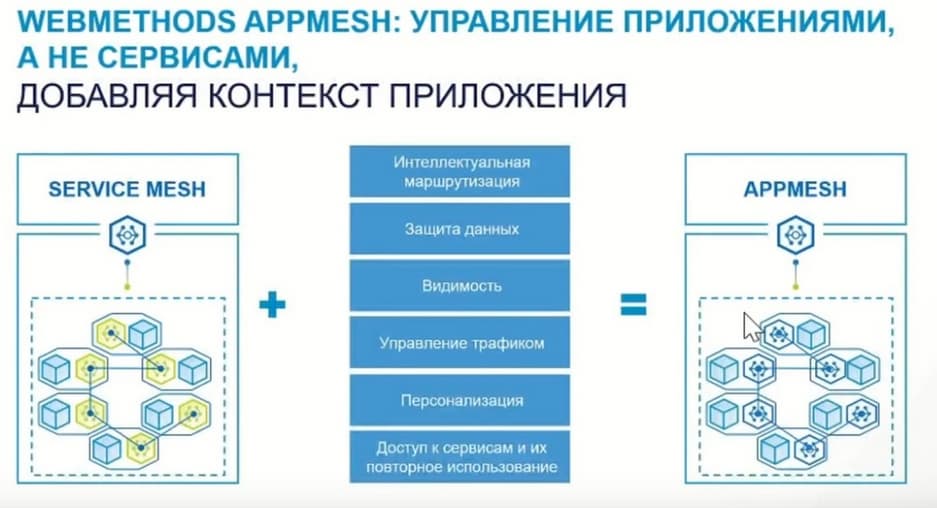 Software AG объявила в октябре 2019 года о выпуске нового продукта, который называется WEBMETHODS APPMESH, он решает задачи, добавляя в контекст приложения решение таких важных задач, как интеллектуальная маршрутизация, защита данных между сервисами, обеспечение необходимой видимости с точки зрения того, каким образом мы могли бы понять, кто конкретно использует наши решения, как выполнять персонализацию. Имеется ввиду персонализация приложения, т.е. какому пользователю должны быть видны какие данные, и какие задачи он может выполнять, используя свои полномочия. Все это переносится на уровень сети приложений.