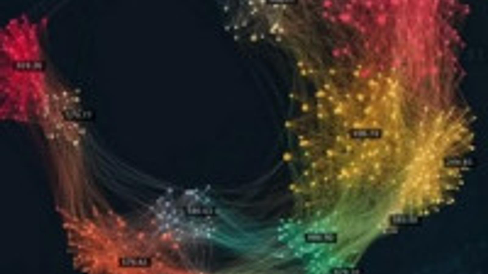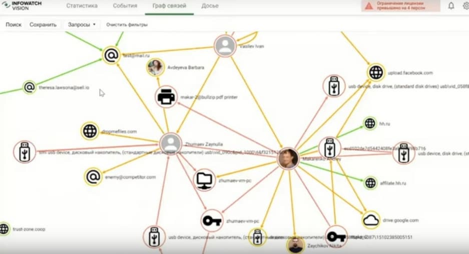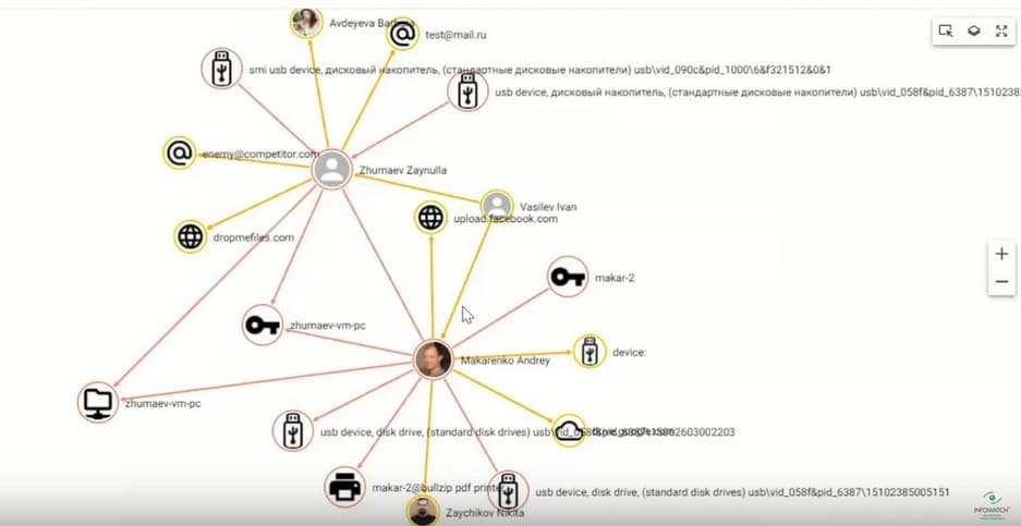 Около пятисот событий, их имеет смысл обрабатывать в виде графа связи, там видны коммуникации этих сотрудников друг с другом. Здесь опять два эпицентра, два сотрудника, можно посмотреть статистику, объекты защиты и как происходят коммуникации, какие средства эти сотрудники используют. Цвет линий показывает уровень нарушений, толщина линий – количество событий внутри. По величине кружка можно понять насколько надо сфокусироваться на конкретном пользователе из целой группы.