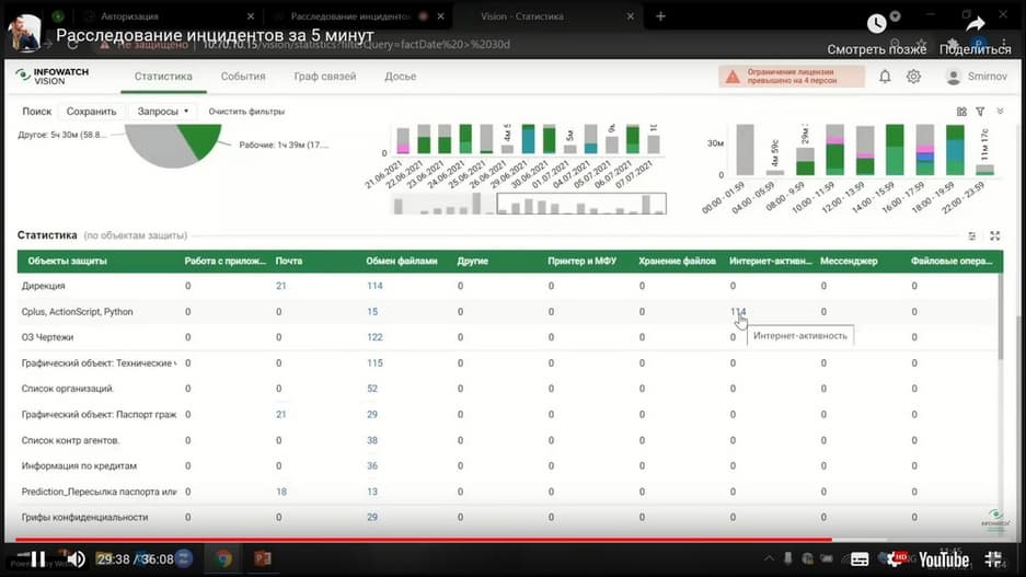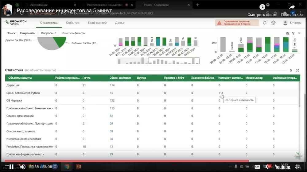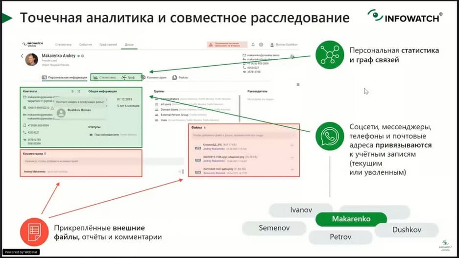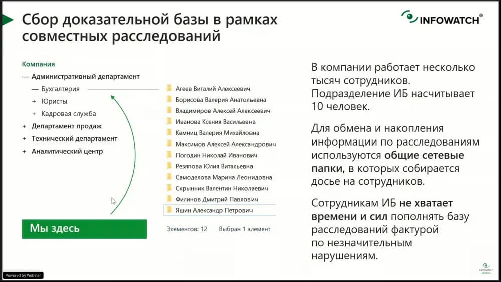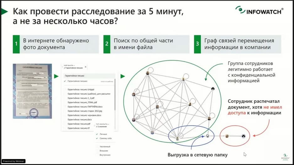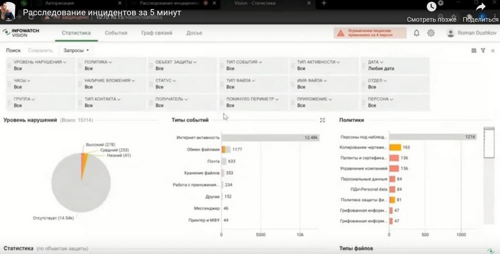 В сегодняшнем мероприятии, которое проводит Роман Душков, ведущий менеджер по техническому сопровождению продаж (компания InfoWatch), обсудим и покажем на практике, как проводить расследование нарушений быстро, реагировать на происходящее в режиме реального времени и поднимать контекст инцидента за минуты. И, конечно, покажем технологические кейсы расследований в системе визуальной аналитики. Как выйти на правильный вектор расследования, когда на это отводятся минуты, и распределить роли в расследовании