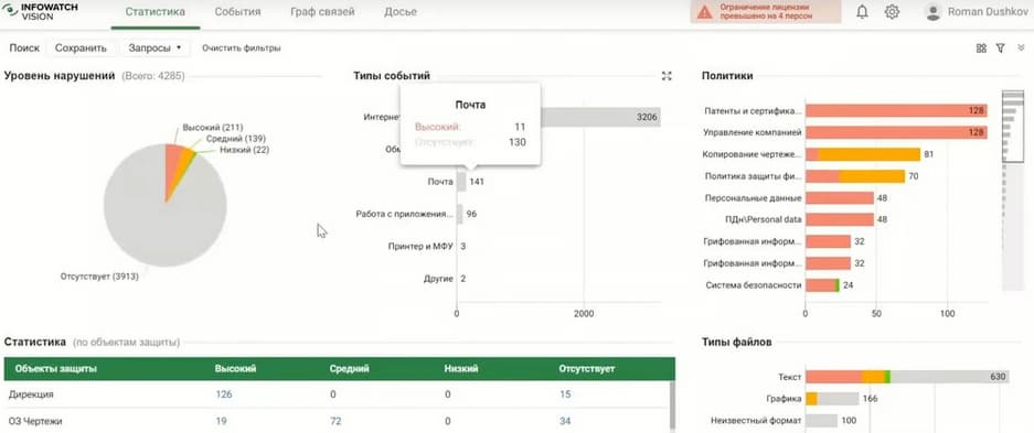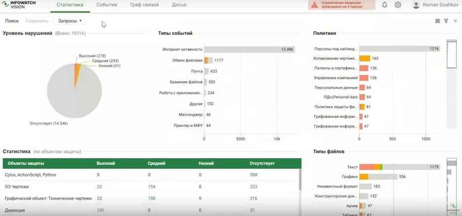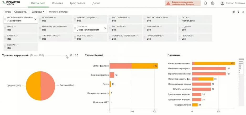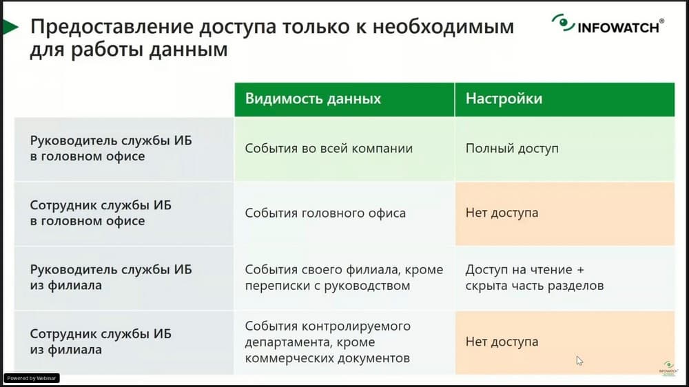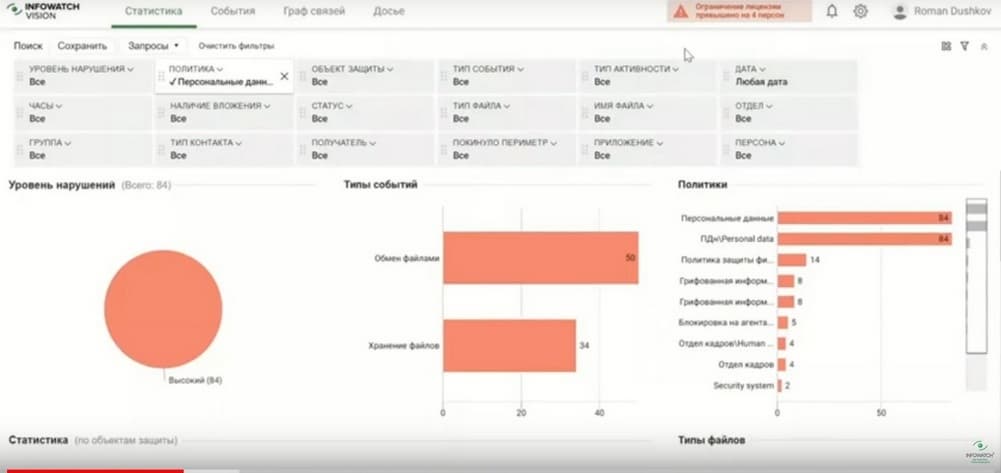 Если нас интересует, например, передача персональных данных или инциденты без нарушений, или инциденты с высоким уровнем нарушений, все это можно ограничить, поэтому когда обращается за помощью HR или экономическая безопасность, то для них специально можно сделать соответствующую ролевую модель или выдать конкретный доступ.