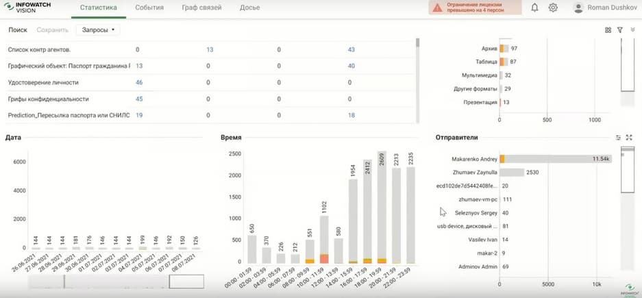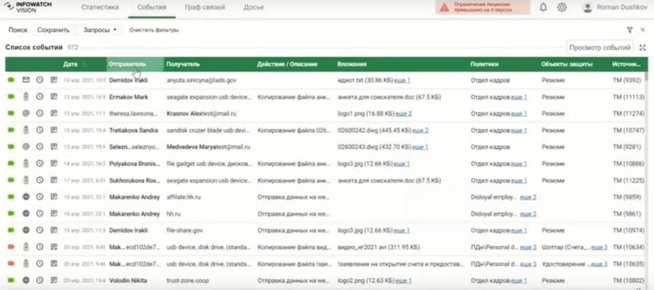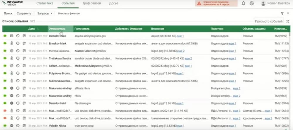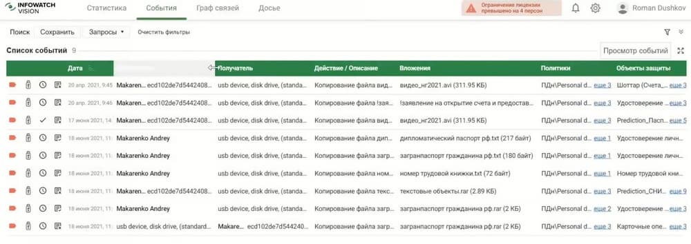 Тут и номера трудовой книжки, данные паспорта, можно посмотреть кто был отправителем и получателем, какое задействовано устройство и какие события произошли. Система может автоматически обрабатывать каждое событие, оповещать нужного сотрудника, либо блокировать передачу.