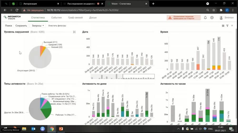 В сегодняшнем мероприятии, которое проводит Роман Душков, ведущий менеджер по техническому сопровождению продаж (компания InfoWatch), обсудим и покажем на практике, как проводить расследование нарушений быстро, реагировать на происходящее в режиме реального времени и поднимать контекст инцидента за минуты. И, конечно, покажем технологические кейсы расследований в системе визуальной аналитики.