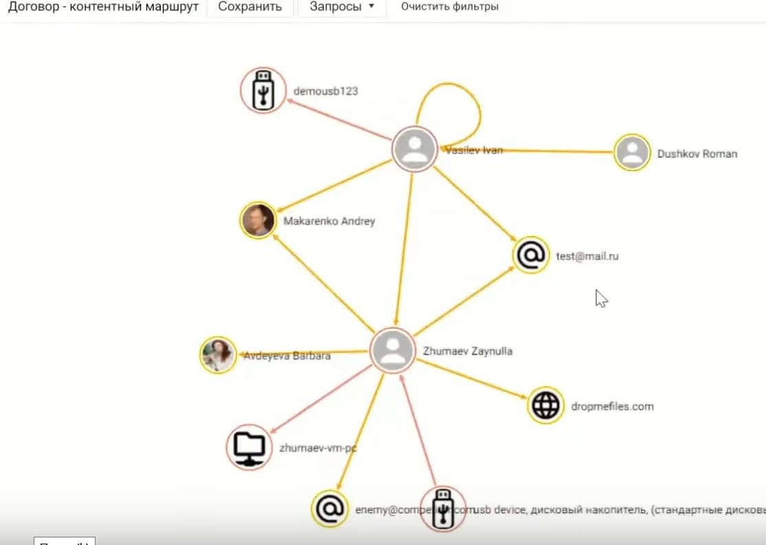Это в основном связано со спецификой работы Vision, поскольку эта система не делает сложных запросов в БД, она «крутит» все данные в оперативной памяти и поэтому работает очень быстро. Десятки и сотни тысяч инцидентов можно фильтровать за секунды, классические подходы в DLP-системах такое реализовать не дают. В данном случае был некий документ, который уже обнаружили в Интернете – фотография гарантийного письма. По лингвистическому анализу или при помощи цифровых отпечатков в системе было обнаружено это гарантийное письмо. Контентный маршрут поможет проанализировать весь цикл объекта. Тут видна абсолютно легитимная группа пользователей, она работает с документом, пересылает его друг другу и сами себе (петли рядом с контактами) и все это в рамках бизнес-процессов. Но тут кто-то выгрузил файл в файловое хранилище, оттуда другой пользователь распечатал документ, так произошла утечка. Стрелки показывают направление движения файлов. Объекты без привязки к конкретному тексту тоже можно анализировать.