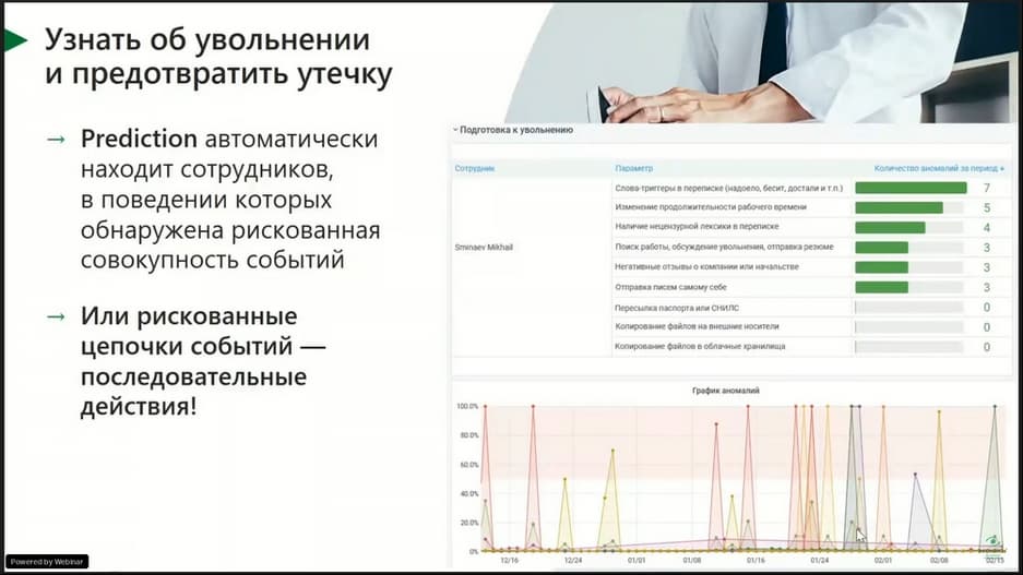 DLP - это огромный пласт по сбору информации, которую можно анализировать не только на лету, осуществлять блокировку и оповещении офицеров ИБ, руководителей. Можно попробовать оценить вероятность будущих событий. Психологи и лингвисты настроили Prediction на автоматическое распознавание таких ситуаций.