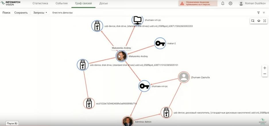 На графе видно, что два сотрудника работают с данными. Сисадмин отношения к данным иметь не может, можно «провалиться» в каждую линию, в каждое событие, можно посмотреть что передавалось на конкретную флэшку, для этого надо кликнуть на соответствующую линию и «провалиться» в событие.
