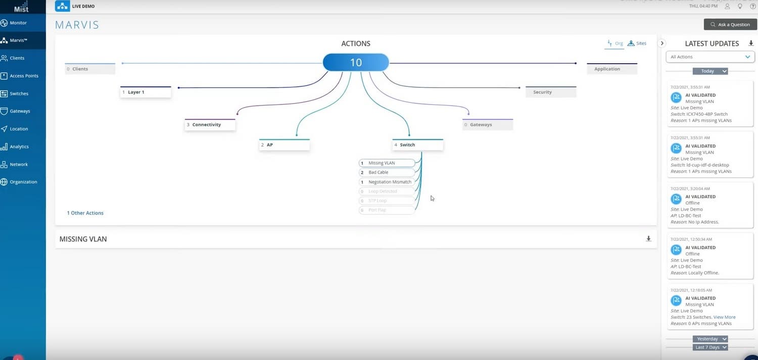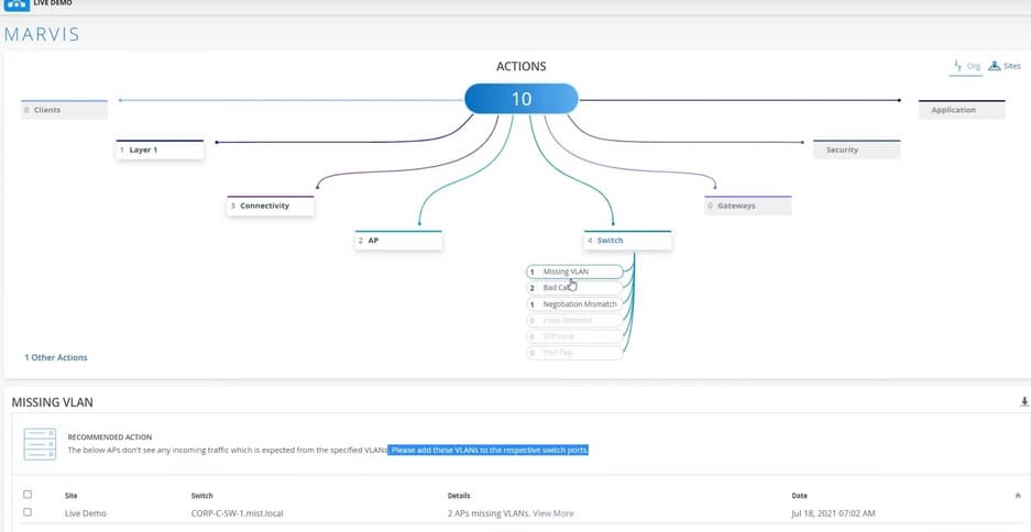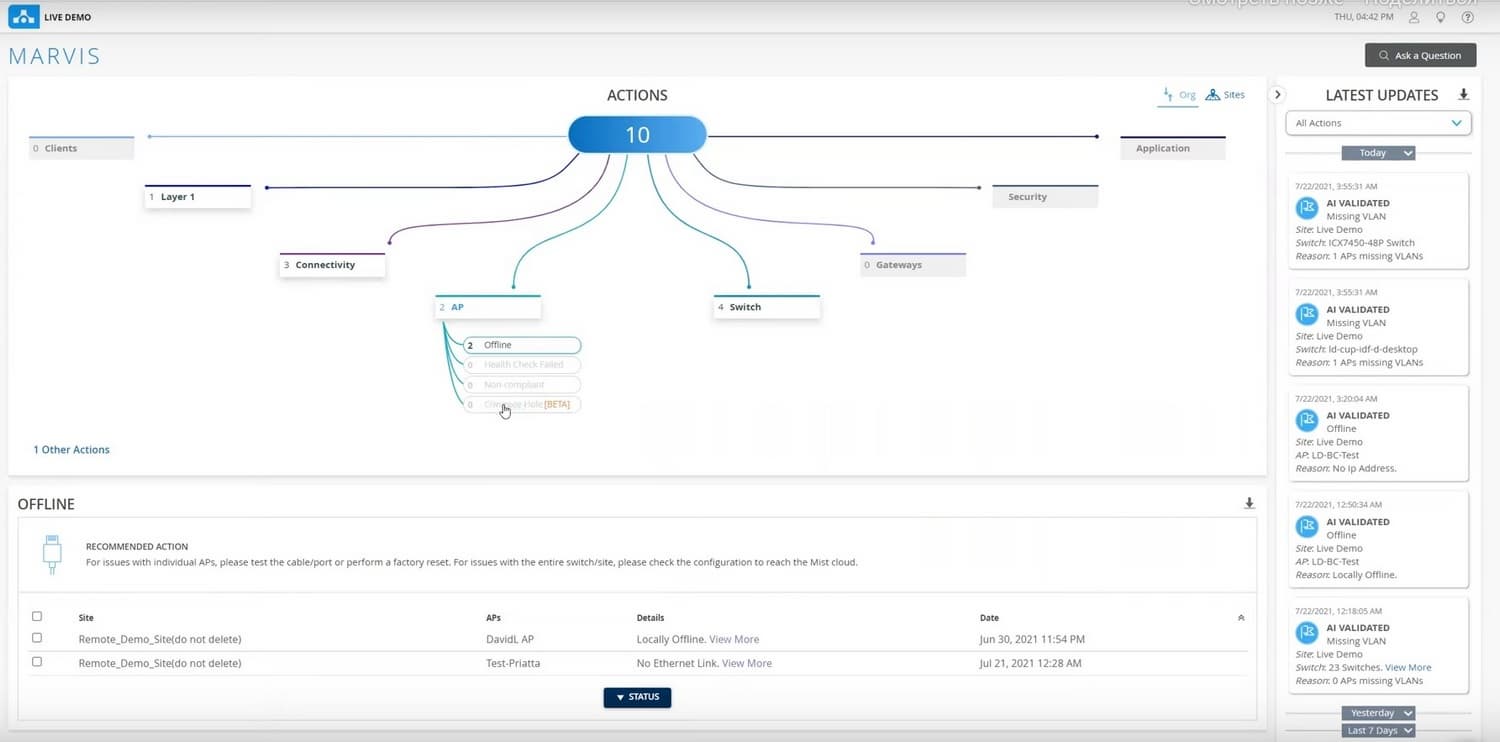 Другой инструмент, который у Juniper сделан на базе ИИ – это Actions Center. Это один экран, в котором высвечиваются все текущие проблемы, которые сейчас существуют в сети. Проблемы с приложениями, с безопасностью, с клиентами, с коммутаторами, с точками доступа. Здесь не показаны проблемы, которые с течение двух минут пропадают самостоятельно, а те, которые необходимо решить.