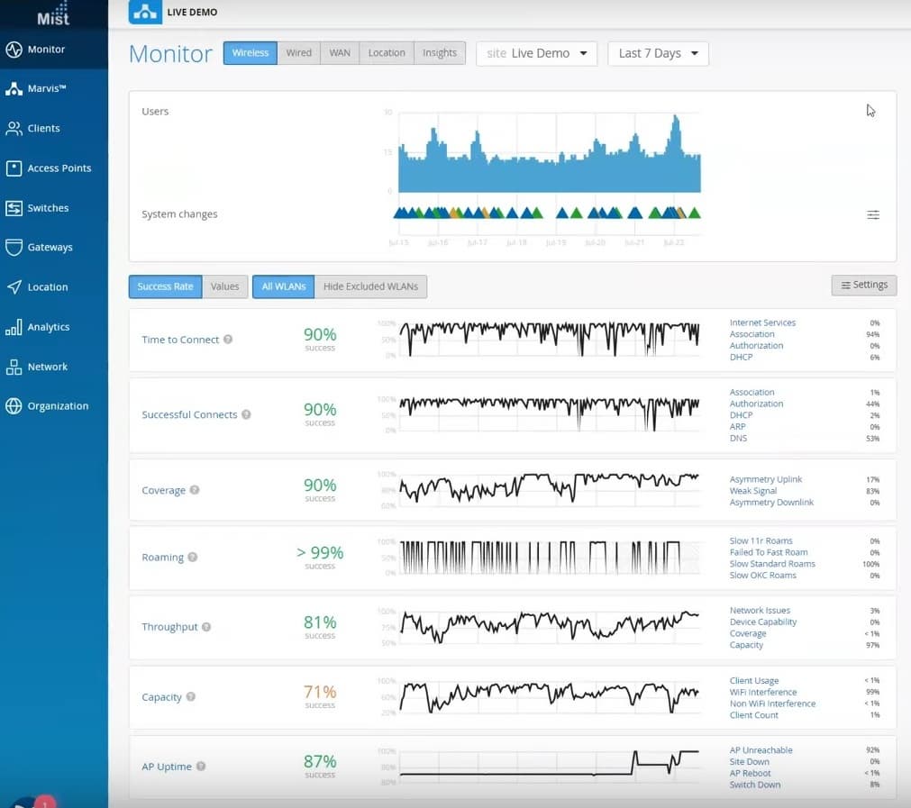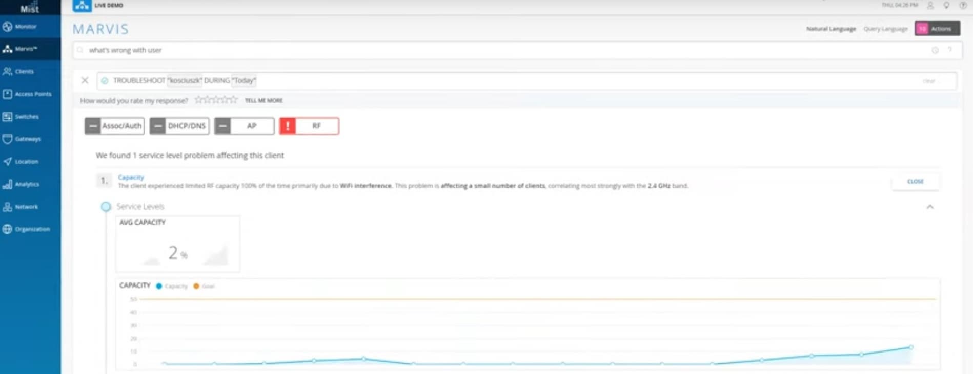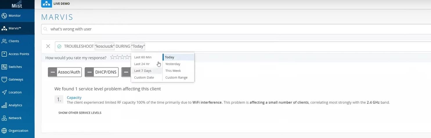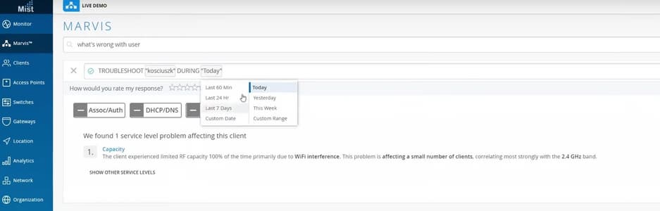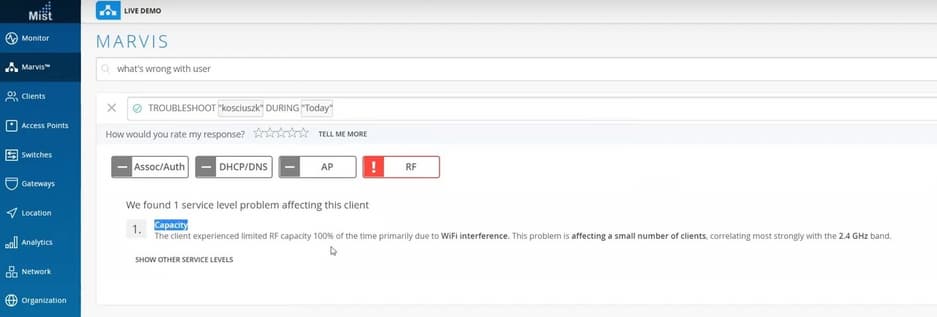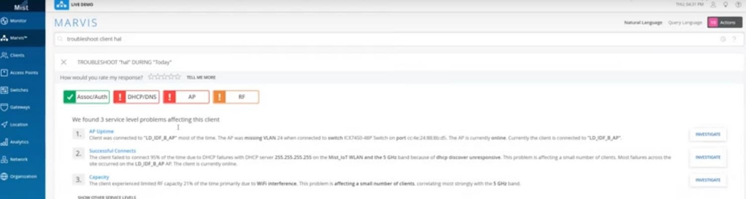 Система показывает, что этот пользователь был подключен к точке доступа, а та, в свою очередь, подключена к коммутатору, на котором не был прописан VLAN 24 на этом порту, поэтому трафик через порт не проходил. Кроме того, 95% времени этот клиент не мог подключиться к сети вообще из-за проблем с DHCP-сервером. Т.е. система точно пишет из-за чего проблемы у пользователя. Также была у Hal проблема с емкостью канала, 21% времени емкость была занижена из-за интерференции Wi-Fi.