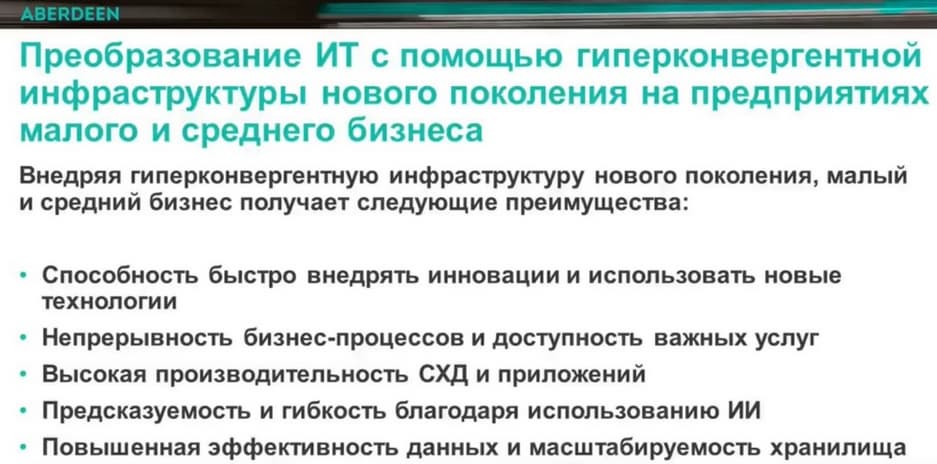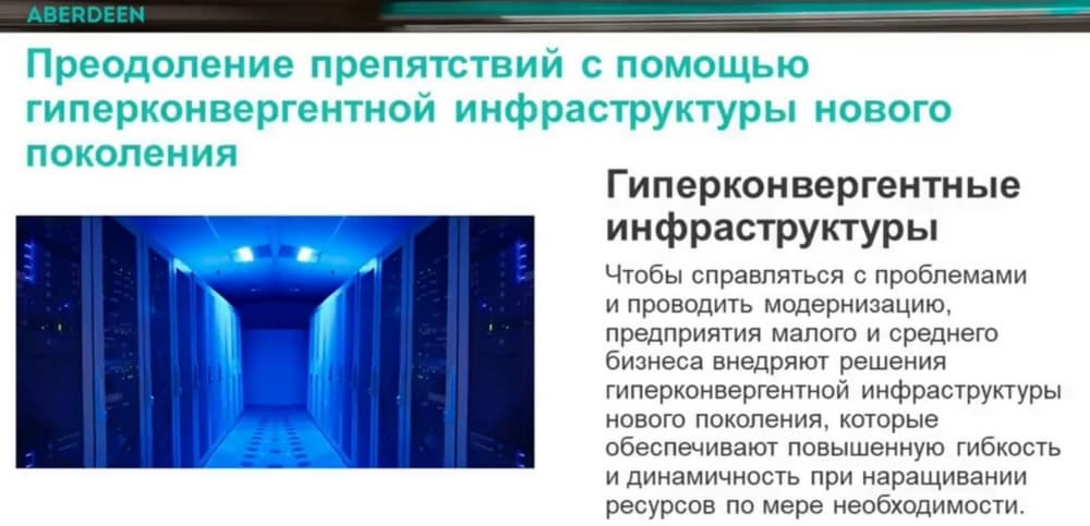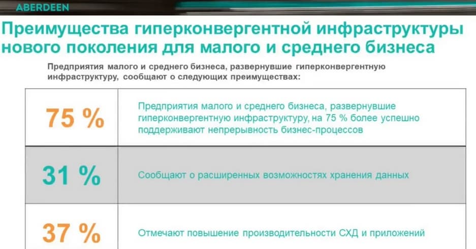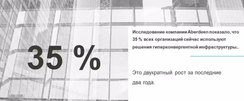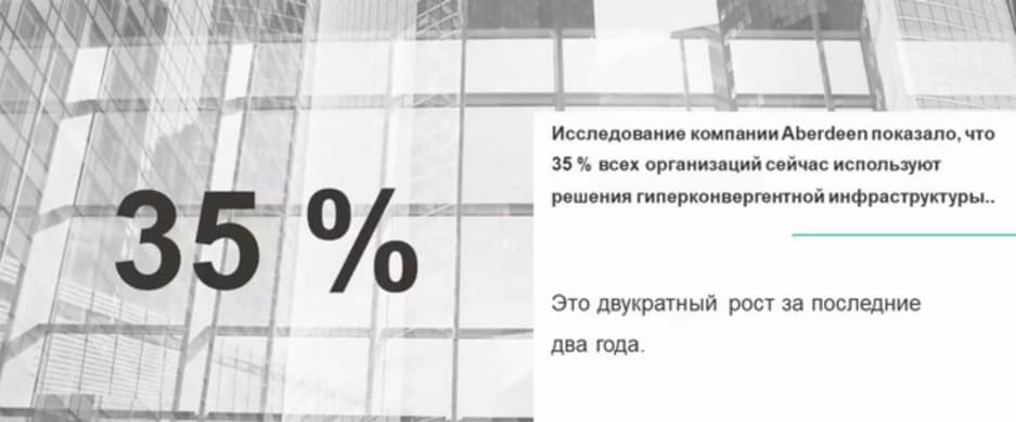 Согласно проведенному компаний Aberdeen исследованию, сейчас гиперконвергентную инфраструктуру используют порядка 35% компаний, за два последних года их число удвоилось.