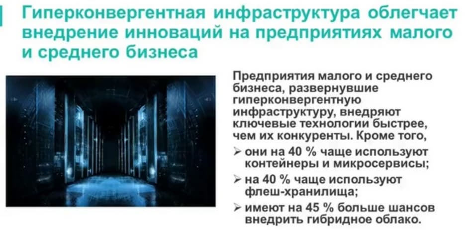 Компании с HCI, особенно СМБ-компании, особенно внедрившие ее 2.0 версию, получают целый ряд преимуществ. У них на 75% чаще получается обеспечить непрерывность бизнес-процессов. Они на 31% чаще обладают расширенными возможностями хранения данных. Обеспечивают защиту данных и лучше ими управляют, успешно справляются с увеличением объема данных. У них на 37% больше шансов добиться увеличения производительности СХД и приложений.