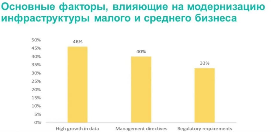 В своих исследованиях Aberdeen обязательно анализирует движущие факторы, спрашивает у СМБ-представителей, что подтолкнуло их к модернизации инфраструктуры. Чаще всего это резкий рост объема данных. Это огромные массивы, которые не должны лежать мертвым грузом. Нужны инструменты для аналитики, средства для масштабирования ресурсов, приложения для обработки. Еще один фактор – это конкуренция и тут много зависит от управления. Здесь важно быть «не хуже соседа», внедрять инновации, следить за трендами, использовать новые технологии, которые есть у конкурентов.