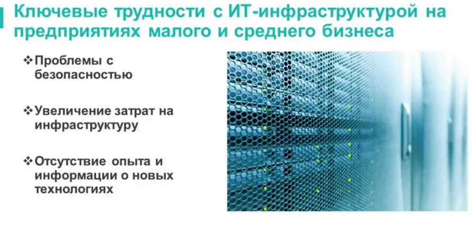 Какие трудности с ИТ-инфраструктурой испытывает СМБ-компании? Что является их причиной? Одна из главных проблем, с которыми сталкиваются многие предприятия, это устаревшие решения, не обеспечивающие должной безопасности. Это касается внутренних коммерческих и инфраструктурных недоработок и внешних опасностей, связанных с заражением вредоносным ПО, выходом из строя базового облака или системы связи.