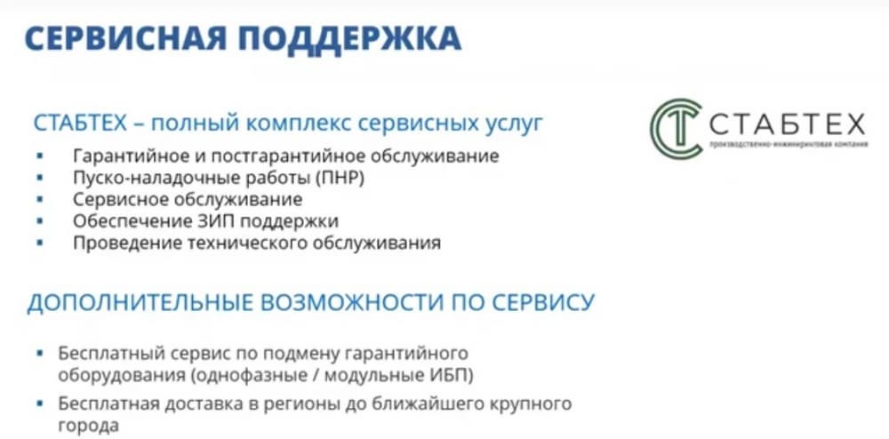 Сервисная поддержка продукции Сайбер Электро представлена заводом-производителем «Стабтех». Это предприятие осуществляет гарантийное и постгарантийное обслуживание. Высококвалифицированные инженеры компании выполняют пуско-наладочные работы. Это в большей степени относится к трехфазным системам. Для сервисного обслуживания имеется складское наличие ЗИПа, который может потребоваться для ремонта, в том числе для экстренного, как и для любого другого технического обслуживания, которое может понадобиться при эксплуатации данных изделий. Есть возможность по обмену гарантийного оборудования. Это касается всех однофазных систем и модульных трехфазных систем.