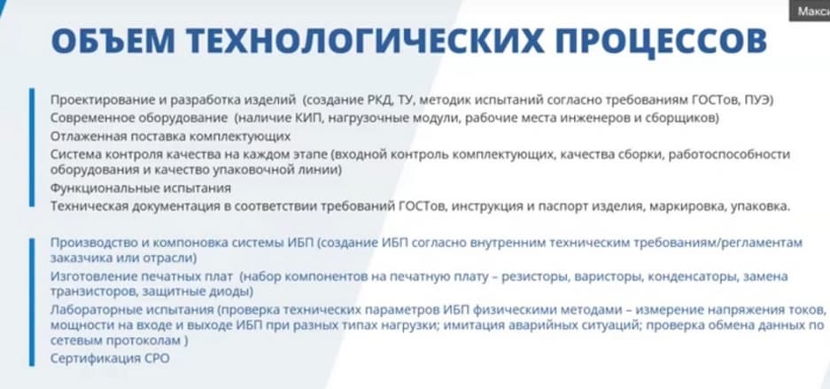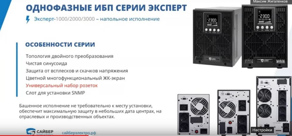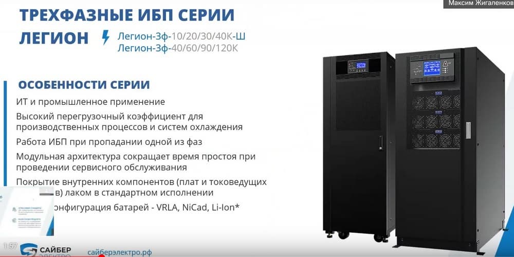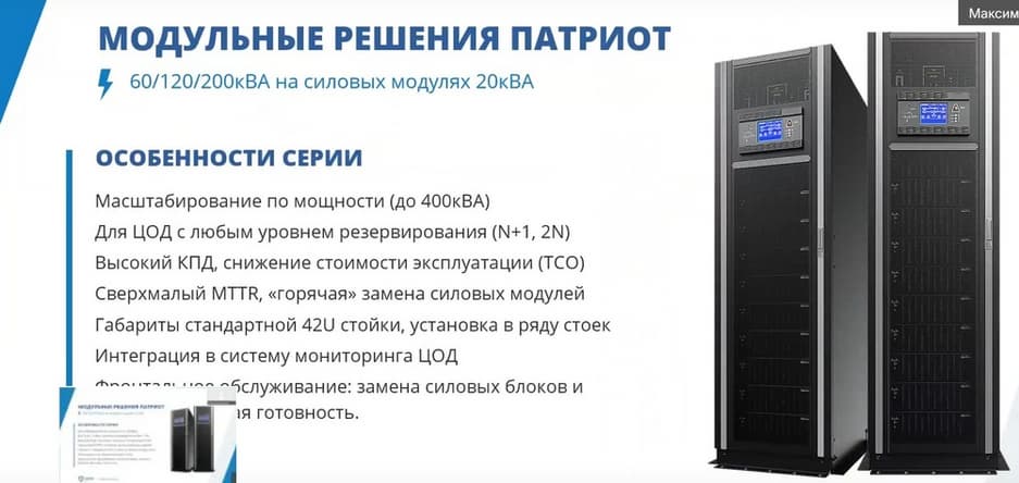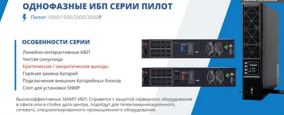 На слайде изображены ИБП 6 и 10 кВт. Обычные однофазные аппараты, в ближайшее время планируется поставка под них батарейных модулей для увеличения времени автономной работы. Потому что изначально они идут в том форм-факторе, какой вы видите на слайде. Поставка этих блоков планируется к лету.