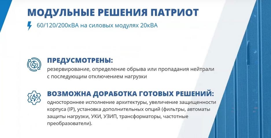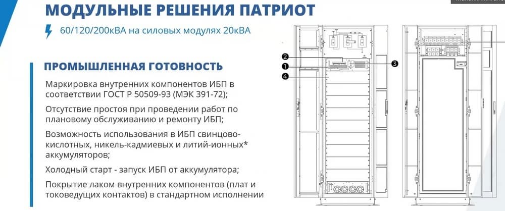 Мастодонтом нашей продуктовой линейки является решение с названием «Патриот». Это полностью модульные аппараты с мощностью от 60 до 200 кВт в шкафных мощностях. Т.к. решение модульное, модули по 20 кВА, то, как вы понимаете, от 20 кВА до 200 кВА могут быть данные решения. Решения могут масштабироваться, т.е. параллельно можно подключить два шкафа мощностью по 200 кВА, и тем самым организовать 400 кВА. Решение надежно, имеет очень высокий КПД, сверхмалое время ремонта. Все модули в данных аппаратах могут заменяться в горячем режиме. Размеры данного решения – стандартная 42-дюймовая стойка, поэтому, используя в ЦОД данный аппарат, вам не придется беспокоиться о том, будут ли они выделяться из общей стены стоек, которые у вас уже имеются. Модули обслуживаются фронтально, т.е. при открывании передней двери модуль демонтируется и устанавливается заново. Имея в ЗИПе хотя бы один ремонтный модуль, всю процедуру можно осуществить за 10 минут, и даже быстрее.