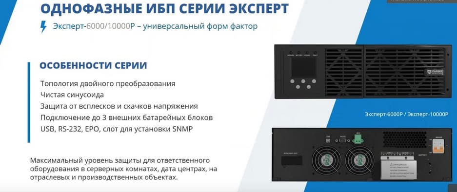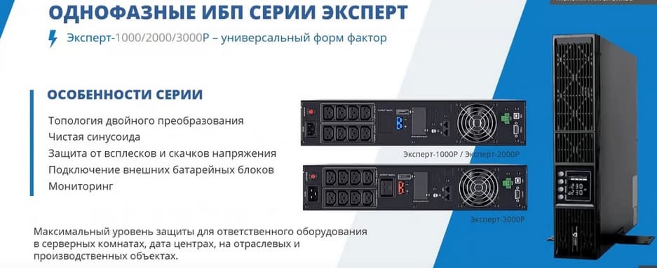 Перейдем от трехфазных систем к однофазным, которые на данный момент представлены серией «Эксперт». Серия делится на два сегмента: «on-line» и линейные интерактивные аппараты. Начнем с «on-line» систем. Эти системы представлены аппаратами от 1 кВт до 3 кВт на топологии двойного преобразования. Чистый синус на выходе. Возможность подключения батарейных блоков. И дистанционный мониторинг системы. К отличительным моментам можно отнести возможность автоматического переворота экрана и увеличение мощности. Эти же решения присутствуют в нашей линейке в мощностях от 6 до 10 кВт.