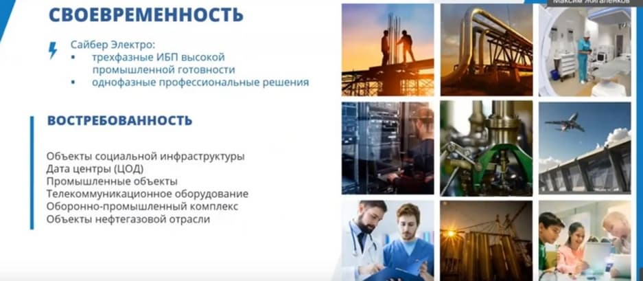 Линейка продукции, которая выпускается в компании Сайбер Электро, это трехфазные ИБП высокой промышленной готовности и однофазные профессиональные решения, эти два мощнейших направления, существующих на сегодняшний момент в виде товара, перекрывают около 70% потребностей российского рынка. Где они могут быть востребованы? Это любой объект социальной инфраструктуры, data-центры или ЦОДы, начиная от самых маленьких и заканчивая серьезными большими ЦОДами, любые промышленные объекты. Причем эти источники применяются как на простых этапах работы, это может быть аварийное освещение, а может быть пожарная сигнализация, и до защиты производственных линий. Т.е. тех основных процедур, которые происходят на производстве: всевозможное телекоммуникационное оборудование, сюда же относятся системы видеонаблюдения. Оборонно-промышленный комплекс давно уже использует ИБП от «малышей» (которых в настоящий момент пока нет в нашей линейке) и заканчивая мощными большими решениями, о которых мы сейчас говорим. Безусловно, это и объекты нефте-газовой отрасли. Это основные векторы, куда направлено внимание компании Сайбер Электро.
