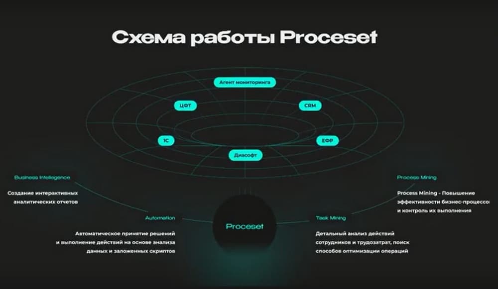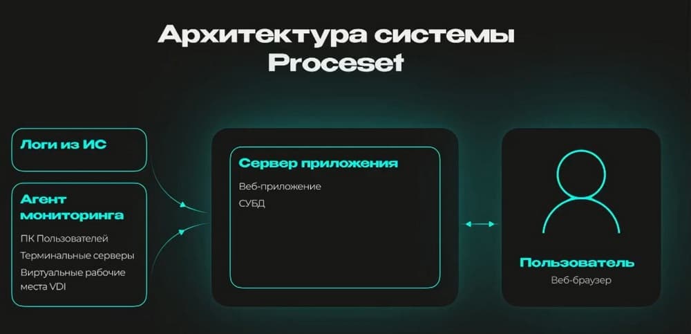 Архитектура системы Proceset состоит из сервера, на который приходят данные с модуля мониторинга, из информационных систем, все это отображается вэб браузере в виде отчетов с возможностью настройки различных сценариев.