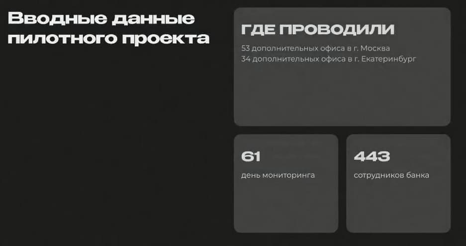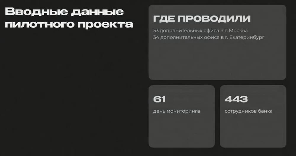 Данный проект проходил в различных филиалах банка, 443 сотрудника участвовали в этом эксперименте. Были использованы несколько подходов. При первом были осуществлены поиски тех операций, которые часто повторяются в рамках рабочего дня.