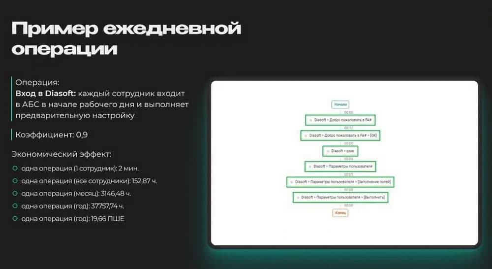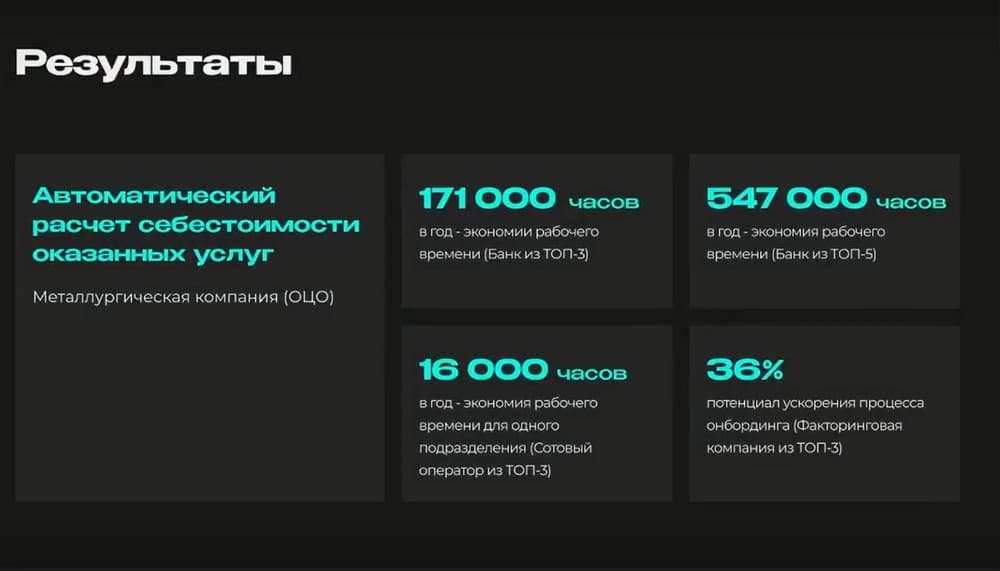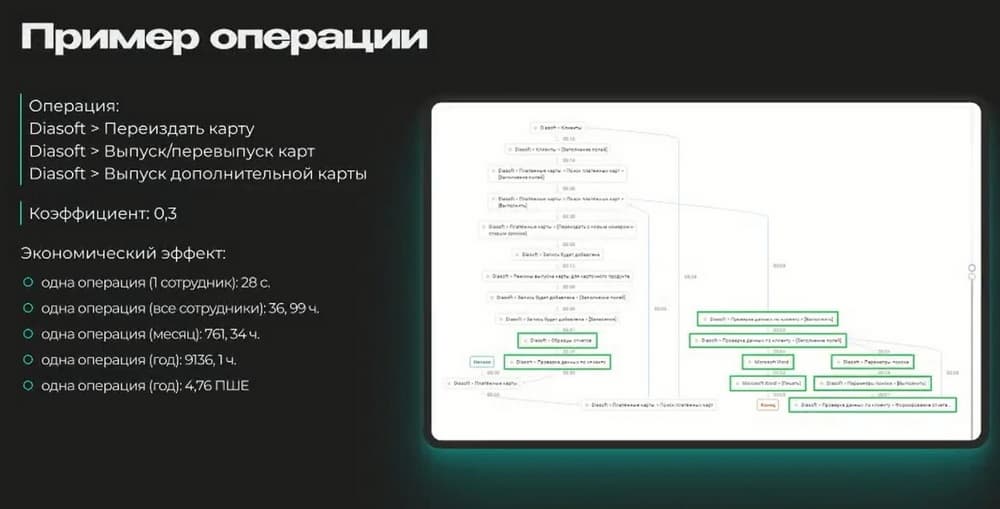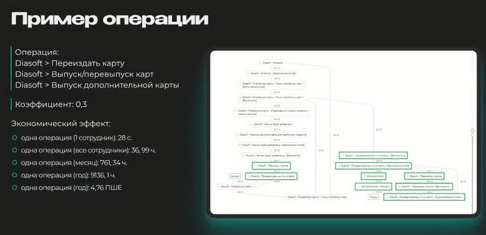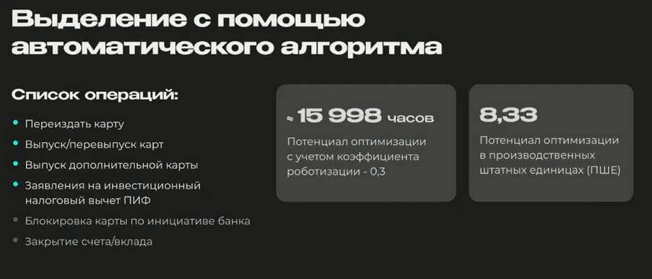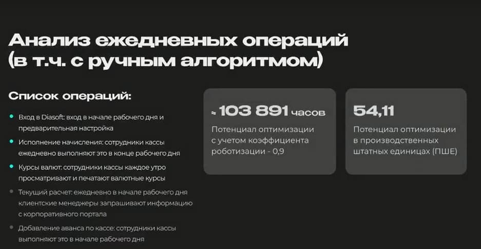 Другой кейс, в банке мы нашли операции, автоматизация и частичная роботизация которых дала экономический эффект в 547 тысяч часов в год. Мы показали на каких участках стоило получить такую экономию. Здесь были очень рутинные процессы, которые очень часто повторялись.
