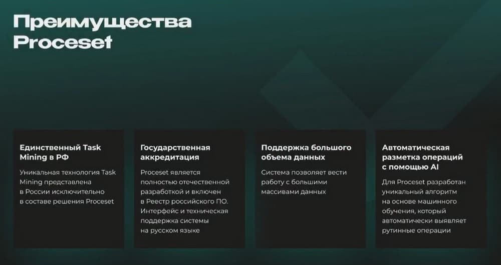 Продукт Proceset зарегистрировал в реестре отечественного ПО, наша компания является единственным поставщиком Tack Mining в России, может работать с большими данными и у нас есть алгоритм, который автоматически детектирует рутинные операции.