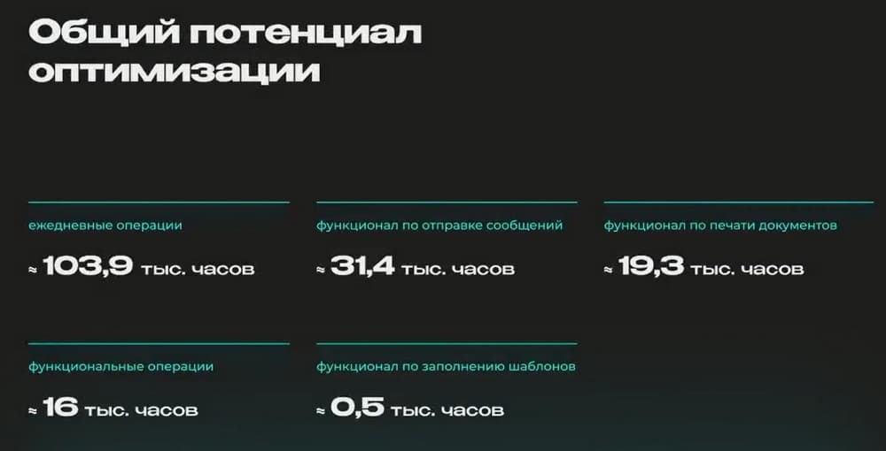 В сумме это дает порядка 170 тысяч часов ежегодно, которые можно экономить, но это не только экономия ресурсов, это еще и увеличение скорости обслуживания клиентов.