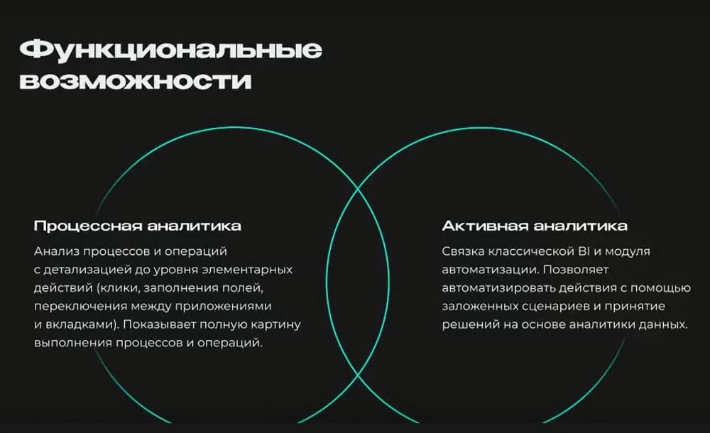 Для этого нами используется две технологии, это процессная аналитика, которая состоит классического Process Mining. Т.е. мы забираем данные из учетных систем, а также у нас есть уникальная возможность – это мониторинг бизнес-действий пользователей, т.е. отслеживается нажатие на различные элементы управления в информационных системах. Это позволяет увидеть до мельчайших деталей как в реальности выполняется бизнес-процесс. Какие у него есть участки, которые можно оптимизировать, сократить трудозатраты, может совсем исключить какие-то участки.
