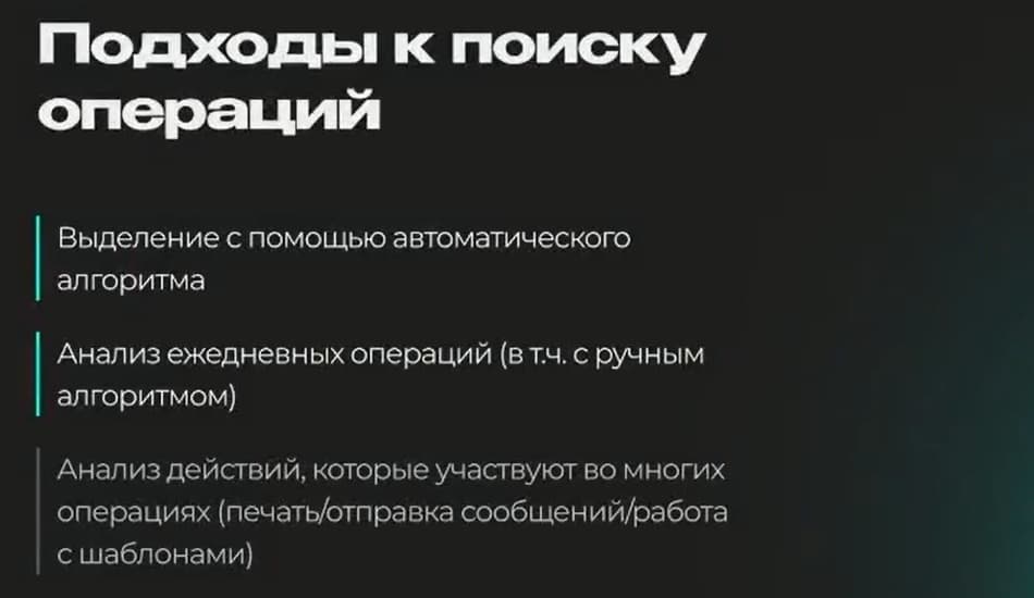 На первом этапе с помощью автоматического алгоритма было выделено 30 самых затратных по времени операций и из них оставили 15 операций. Мы провели глубокий анализ этих операций совместно с командой RPI, которая была в этом банке.