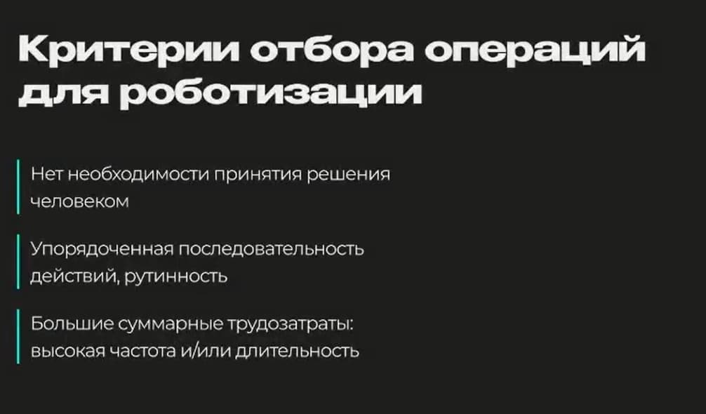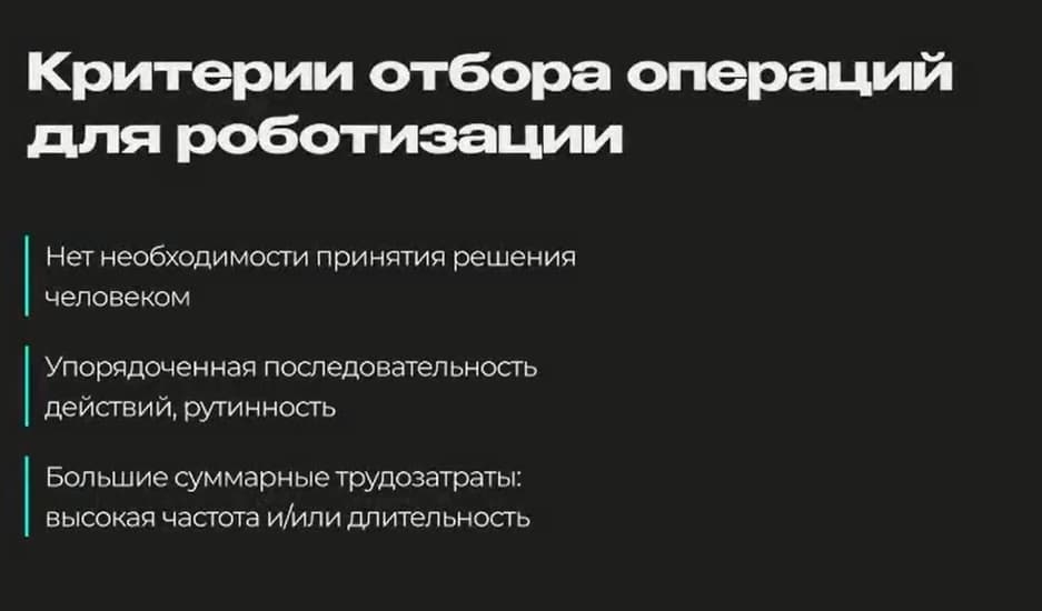 Какие были выбраны критерии? В этих операциях не должно быть принятия решений, они должны быть достаточно рутинными, на них должно приходиться очень много трудозатрат. Критерий большого количества времени и рутинности поможет найти и отранжировать операции по тем затратам времени, которые на них тратится, можно ли их автоматизировать.