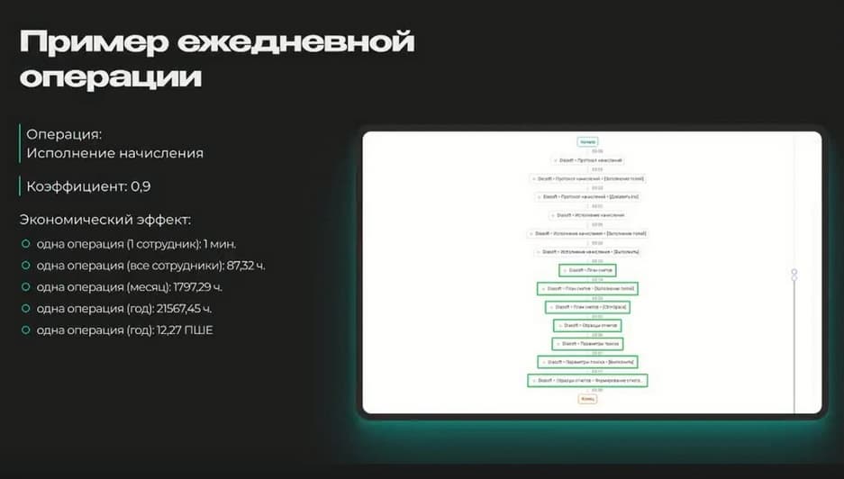 Следующий кейс про операцию начисления изображен на слайде. Видно как система детектировала эту операцию и те участки, которые можно роботизировать.
