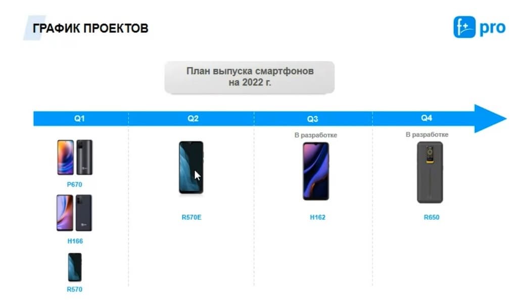 Если говорить про план выпуска смартфонов на 2022 год, то надо заметить, что мы немного улучшили модели R570 - R570Е. Cо второго квартала появилась партия устройств уже с гироскопом. И в разработке у нас сейчас находится устройство Unisoc. И в IV квартале 2022 года ожидаем обновленную модель защищенного устройства, модель R650 с увеличенным экраном и обновленным, более мощным процессором и улучшенной камерой.