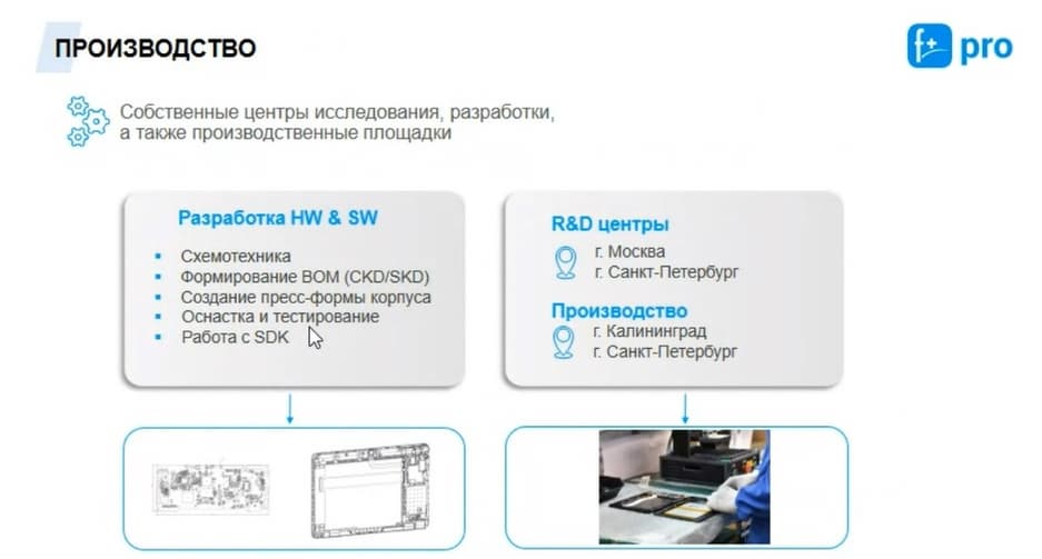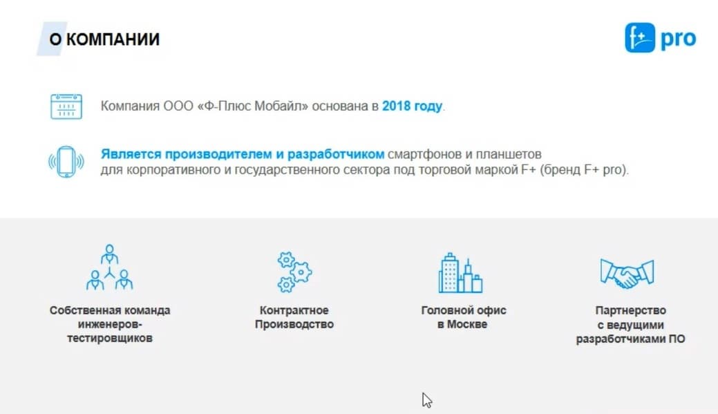 «Ф-ПЛЮС МОБАЙЛ» имеет достаточно компетентный состав сотрудников. Ранее они занимались разработкой мобильных устройств. У них есть опыт как разработки, так и производства, они сами тестируют оборудование и работают с ключевыми фабриками на территории РФ и азиатских стран, в том числе и на территории Китая. Говоря о производстве мобильных устройств, сложно говорить о том, что это полностью российский продукт, потому что вся компонентная база берется из Китая. Но есть ряд компонентов, которые разработаны в России. Мы применяем контактное производство и пока мы не видим необходимости в создании собственных производственных мощностей. Головной офис находится в Москве на Преображенской площади в пределах третьего транспортного кольца, недалеко от метро. Мы можем охватить проекты любой сложности, для любой отрасли.