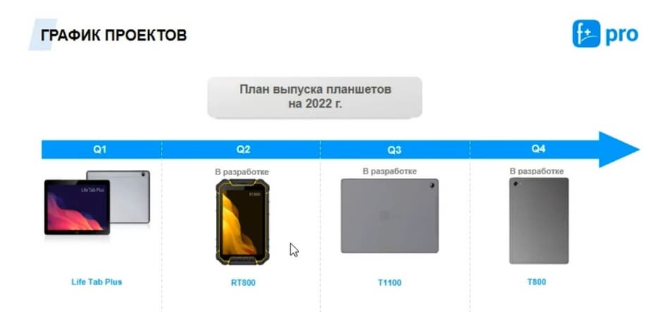 По планшетам история следующая. Life Tab Plus уже готов, его можно заказывать в любой момент. В разработке у нас модель защищенного планшета. Но на нем не буду подробно останавливаться, потому что создан специально под узкопрофильные задачи для силовых ведомств, либо нефтегазовой промышленности. Акцент хочу сделать на моделях Т1100 и Т-800 с банальной целью заменить в текущих реалиях топовые бренды. Потому что по спецификации они будут в определенной мере даже лучше, чем те устройства, которые сейчас присутствуют на розничном рынке. В III квартале ожидается выпуск модели Т1100.