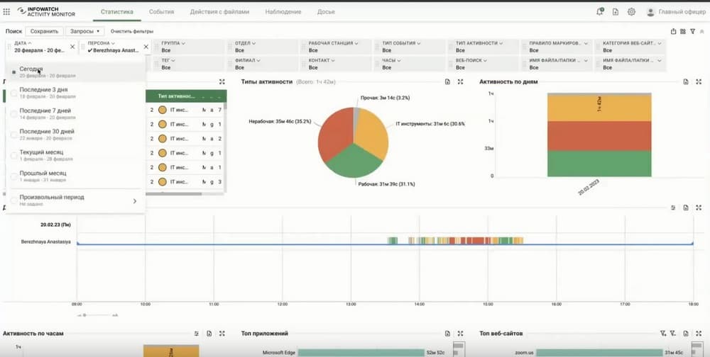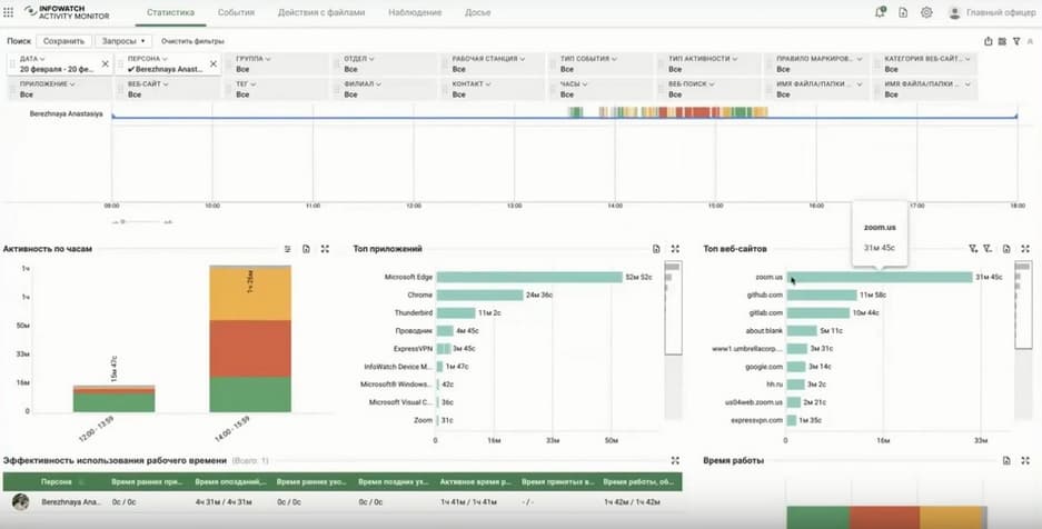 Он просматривает статистику активности рабочего дня и видит, что сотрудник 20 февраля 2023 года посещал вэб-версию ZOOM и в целях безопасности решает пойти глубже в детализацию и переходит в раздел «Наблюдения».