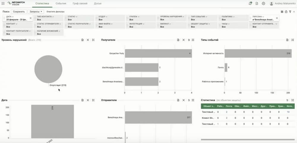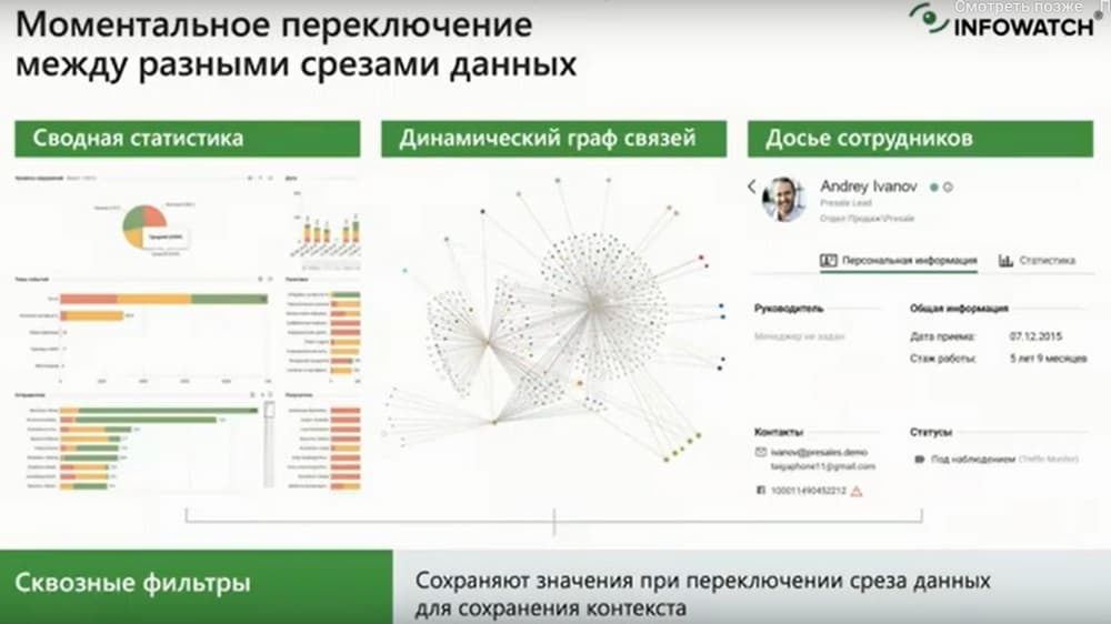 Эта система позволяет повысить скорость и качество принятия решений. Это продукт используется как основной дэшборд в работе с DLP, потому что он позволяет как охватить всю ситуацию целиком, так и погрузиться детали, используя большое число фильтров. InfoWatch Vision также позволяет разобрать неразмеченные события и выявить необходимость актуализации политик. InfoWatch Vision – это сводная статистика по событиям, это динамический граф связи по которому видны все субъекты коммуникаций, кто с кем общается. В досье сотрудников ведется карточка сотрудника, эта информация дает сориентироваться ИБ-офицеру по сотруднику.