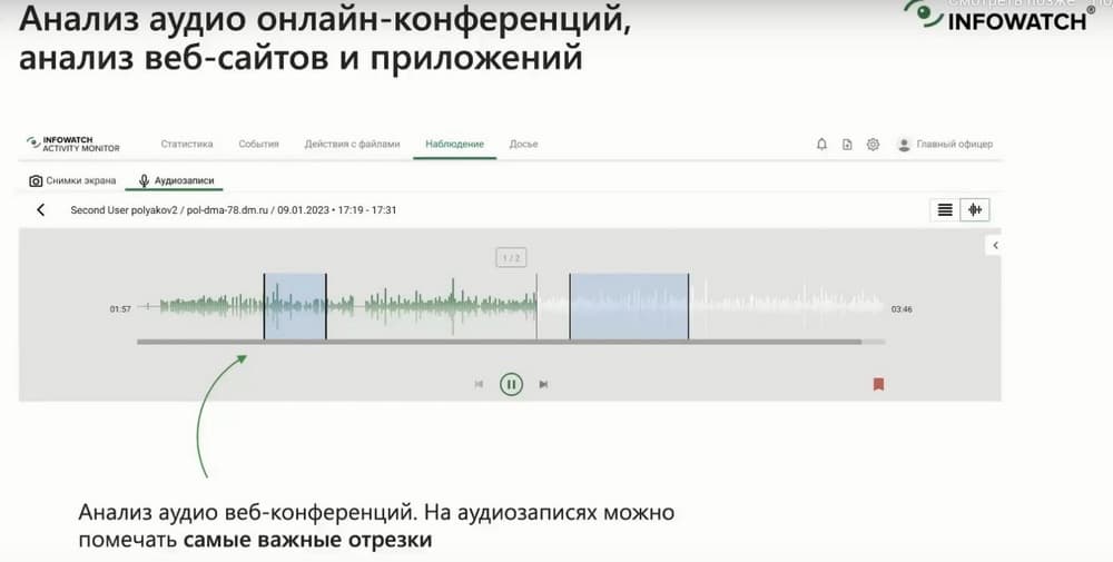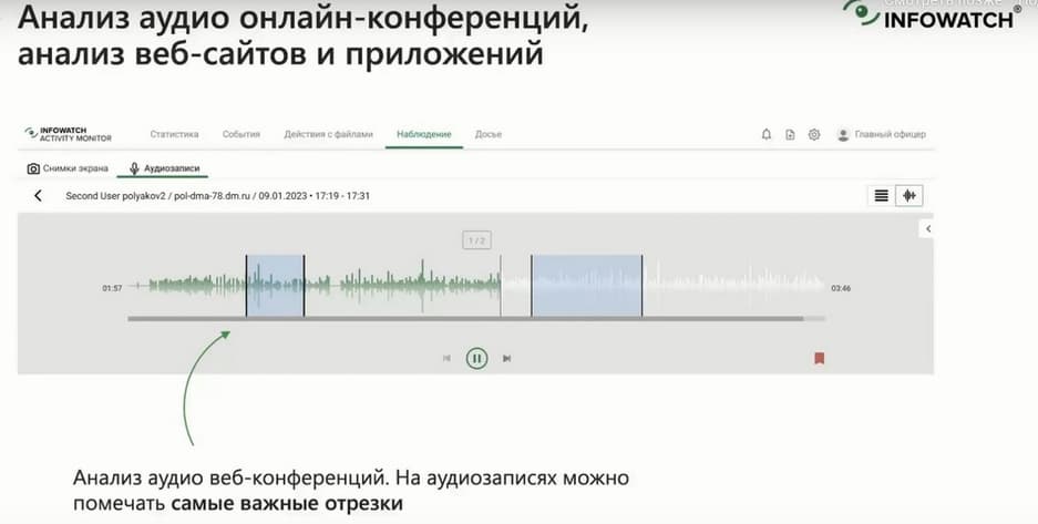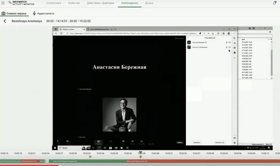 Там он смотрит скрин-шоты, чтобы понять что конкретно делал пользователь. Во временной ленте находит тот момент, когда у пользователя было активно окно браузера с ZOOM и видит, что Анастасия Бережная участвовала в беседе с внешним контрагентом. Офицер переходит в раздел аудиозаписей и прослушивает эту беседу.