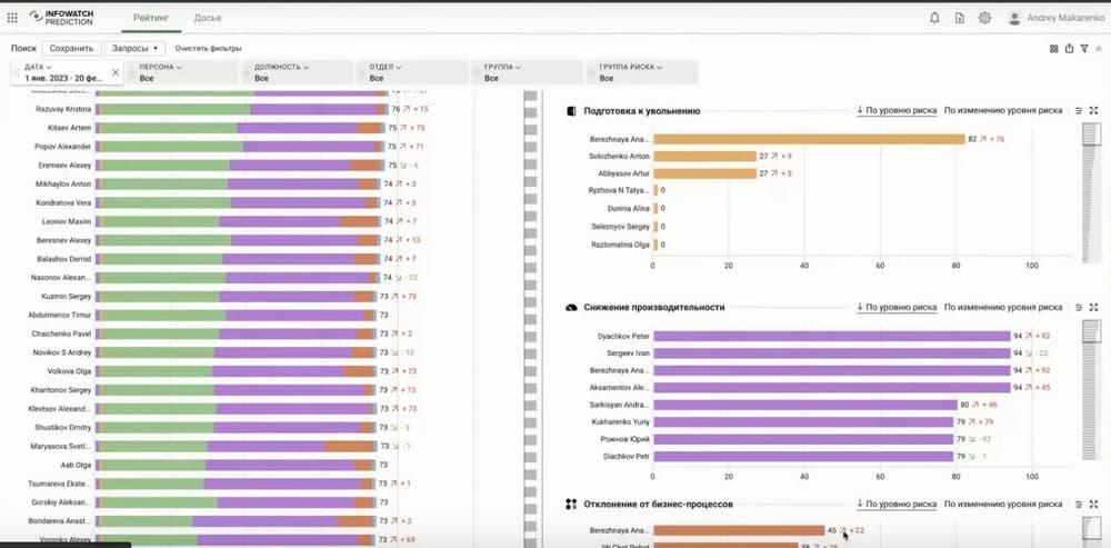 По ней повысился рейтинг по группам риска – подготовка к увольнению и отклонение от бизнес-процессов. Это не является инцидентом, но это то, что требует внимания и бдительности от офицера безопасности. Этот офицер переходит в InfoWatch Prediction, которая сгенерировала данное уведомление, и видит, что действительно Анастасия Бережная попала в топ по данным группам риска.