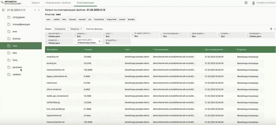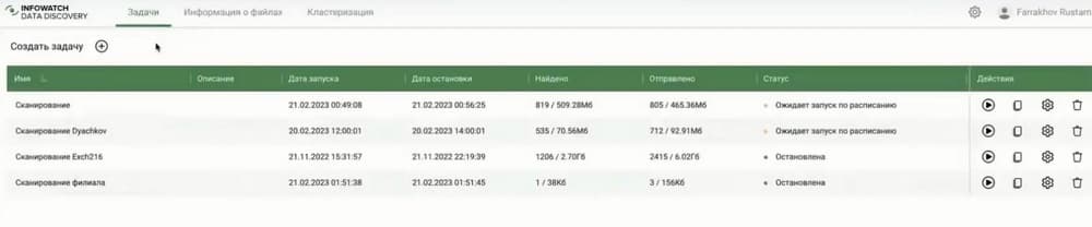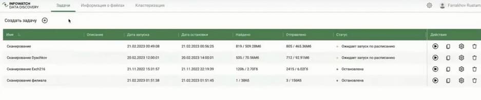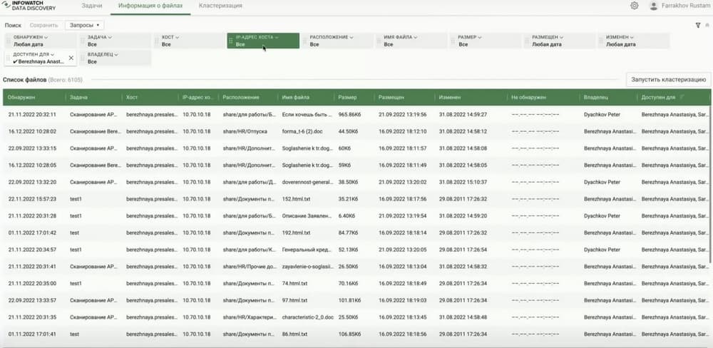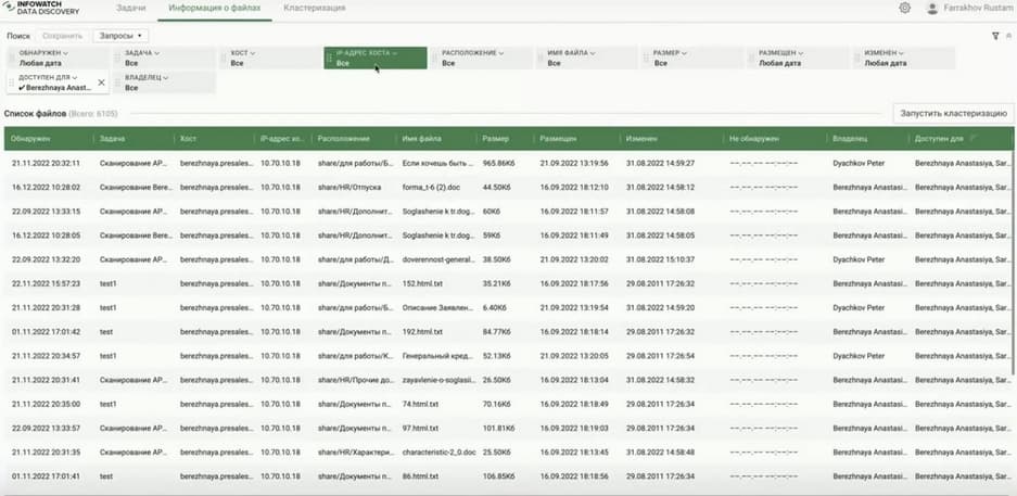 Этот модуль обеспечивает сканирование всех доступных конечных узлов (рабочих станций, серверов) и для того чтобы расширить охват поиска, офицер решает создать задачу на сканирование рабочем машины данного сотрудника. В задаче он указывает хосты и запускает эту задачу. Для ознакомления с результатами сканирования он переходит рубрику «Информация о файлах» и здесь отфильтровываются файлы по критерию «Доступен для» Бережной Анастасии.