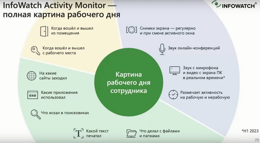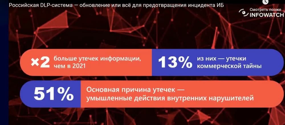 С начала года компания InfoWatch выпустила 20 продуктовых обновлений в DLP-системе Traffic Monitor 7.6 и ее модулях. Был реализован перехват отправки файлов на все облачные хранилища, все веб-сервисы и веб-мессенджеры, был добавлен контроль аудио онлайн-конференций, расширены возможности в среде Linux, были наращены возможности BI и UBA в DLP-системе и многое другое.