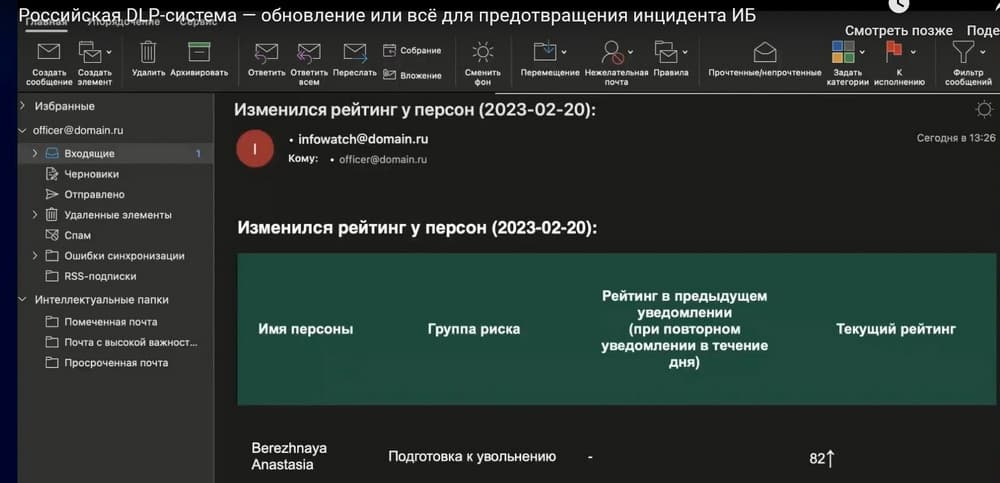 Рассмотрим сценарий одного расследования. Офицер ИБ получает на свою электронную почту уведомление, что возрос некий показатель риска по конкретному сотруднику, это Анастасия Бережная.