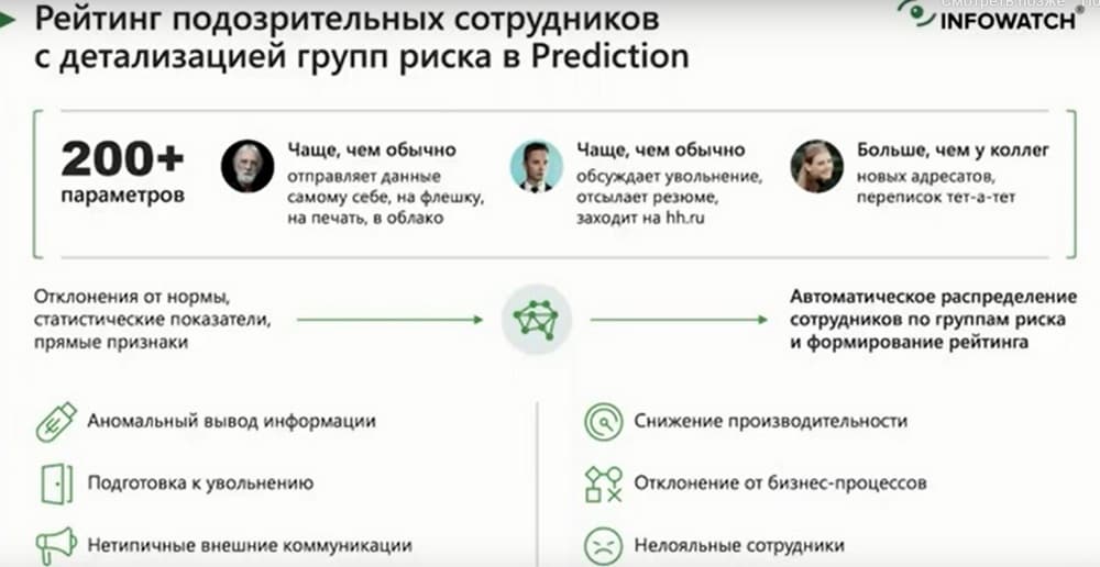 Как это работает? В распоряжении InfoWatch Prediction множество собранных данных DLP- системой и системой мониторинга активности сотрудников, и Prediction, имея в распоряжении такую Big Data, анализирует эти данные по более чем 200 параметрам и строит некие тренды и может выявлять отклонения от этих трендов. Причем нормой может быть как поведение самого сотрудника, так нормой может считаться поведение некой группы сотрудников. В этом случает у него вырастут показатели риска. Сейчас в InfoWatch Prediction реализовано 6 групп риска (см. следующий слайд).