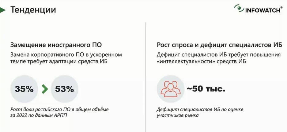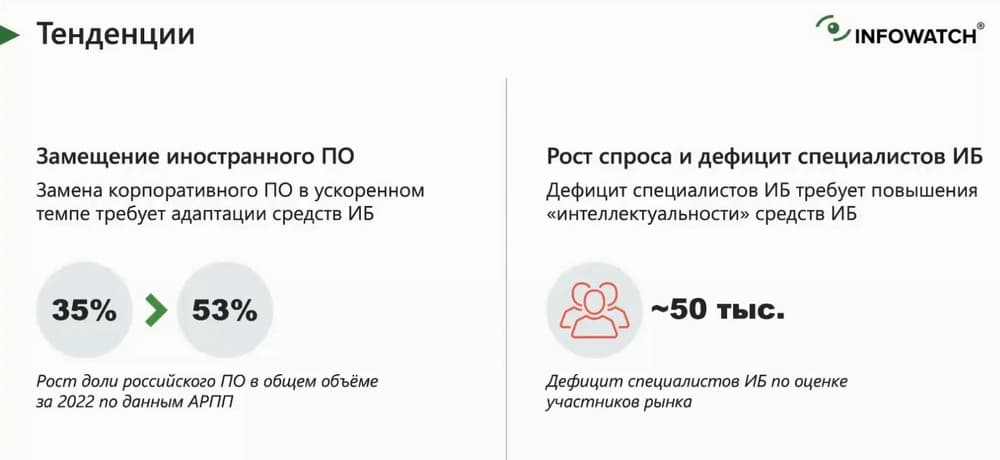 По данным АРПП уровень импортозамещения за 2022 года возрос с 35% до 53% по доле российских программных решений в общем объеме закупок. Второй большой тренд – это рост спроса на ИБ-специалистов. Дефицит ИБ-специалистов требует повышения интеллектуальности средств ИБ. По оценкам участников рынка этот дефицит составляет примерно 50 тысяч человек необходимы в области ИБ.